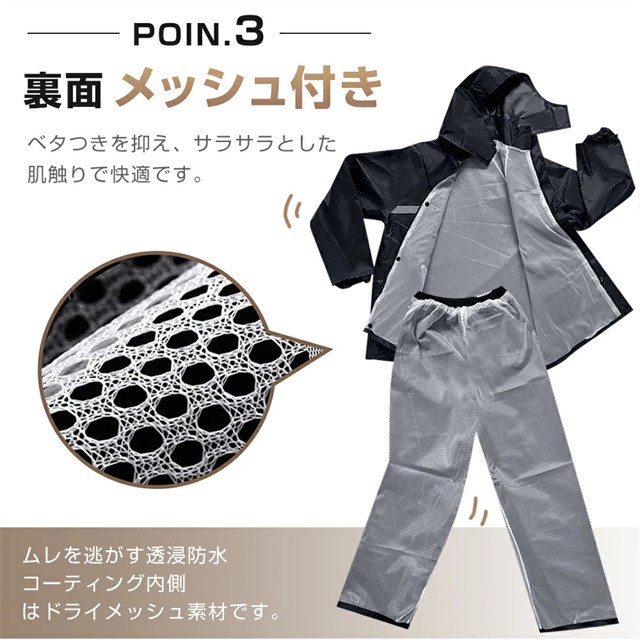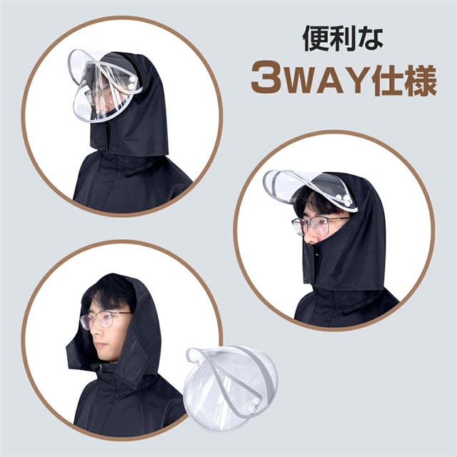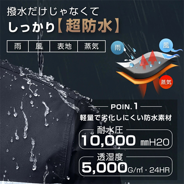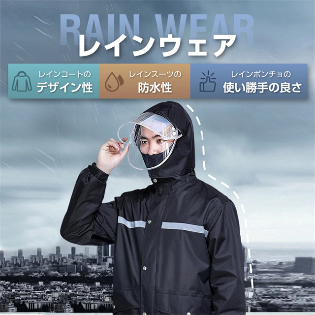 | 特徴 | 【男女兼用レインウェア】 ビジネスや通学などに使いやすいタイプで街歩きだけでなく、自転車、バイクなどにも対応可能なレインウェアです。 革新的な収納式フードと着脱式バイザートップによって、雨の日の自転車運転も驚くほど安全・快適。レインウェアは上下とも、裏地全体にメッシュ素材を使用しており蒸れやベタつきを防止します!日常の通勤・通学・お出かけになどにピッタリの、街で暮らすすべての人に安全・快適を提供する一着です。 【二重レインバイザー付き】 着脱可能なレインバイザー付き、レインコートのフードにつけると、透明の二重つばができて顔を覆ってくれて、クリアな視界を確保できながら、風・雨・雪・飛沫などから顔を濡らさずに守ります。フードはロープで調節可能で、自転車運転などの時にも雨水の浸入を防ぐことができます。収納袋付き、旅行、出張、アウトドアにも楽々持ち運べて、自宅/事務室/車の中に常備すれば、急な雨にも心配はありません。 【撥水・防水・耐久性高め】 耐久性に優れたEVAエコ素材を採用し、耐水圧10,000mm、防水力高め、丈夫で破れにくいレインウェアです。多重撥水加工を施され、水が生地の中に染み込むことなく弾けます。ファスナー+ボタンの二重設計により、ファスナーを閉じてボタンを留めることで雨水や風の侵入を防げ、大雨でも安心なレインコートです。 【反射帯・ポケット付き】 反射テープがあり、夜道や雨で視界が悪い時でも安心安全にご利用いただけます。ジャケット両サイドには大容量のフラップ付きポケットを配置し、利便性も確保しています。 【収納可能なフード】 着たままでフードを丸めてワイドカバーで固定です。バタつき2WAYフードはシーンによって使い分けができます。大きめのフードが頭をしっかりと覆い、顔周りに雫が落ちるのを防ぎます。 |
