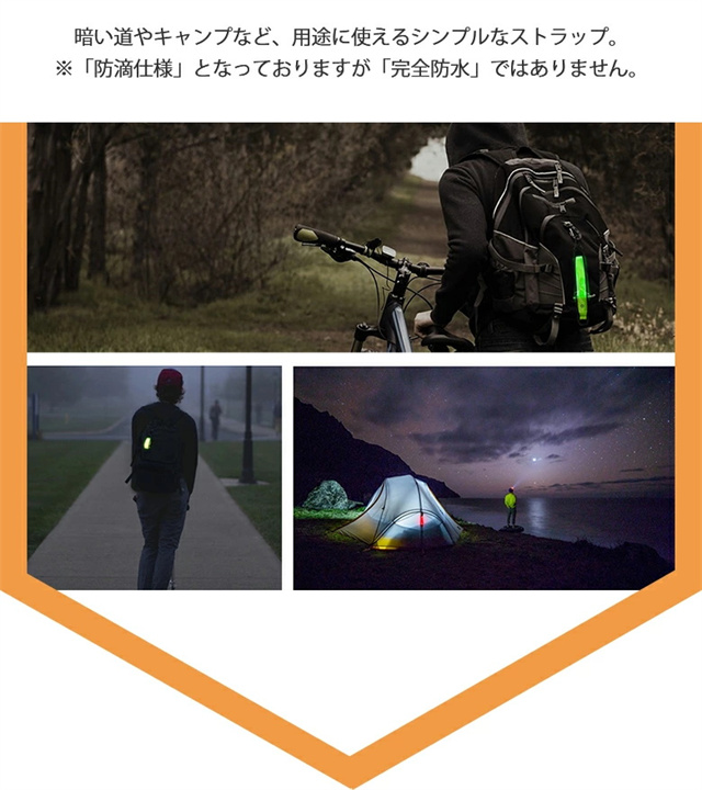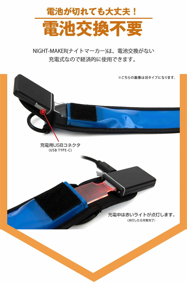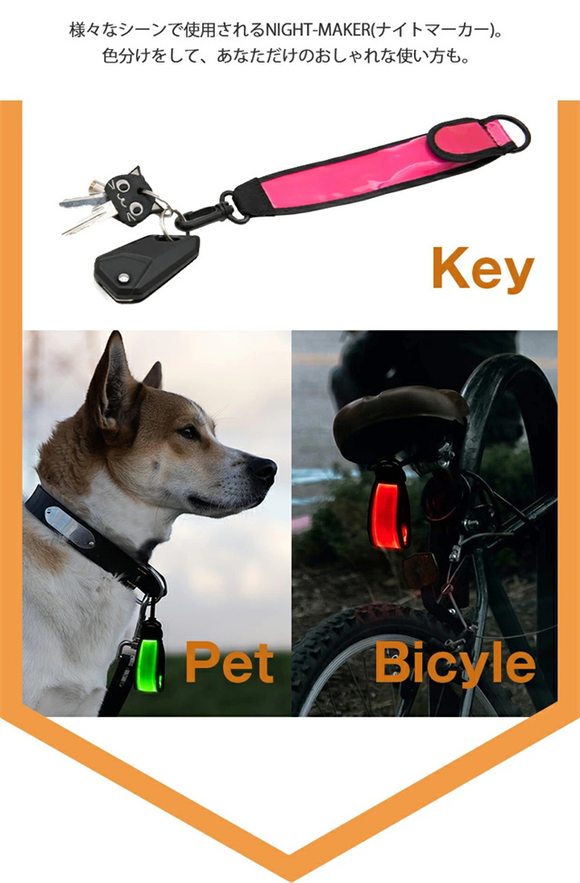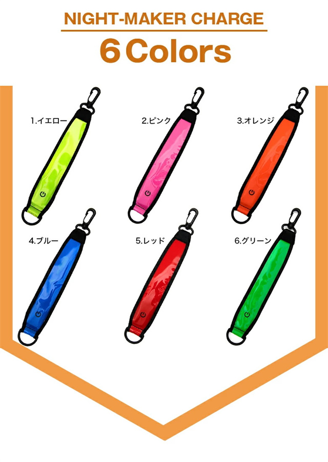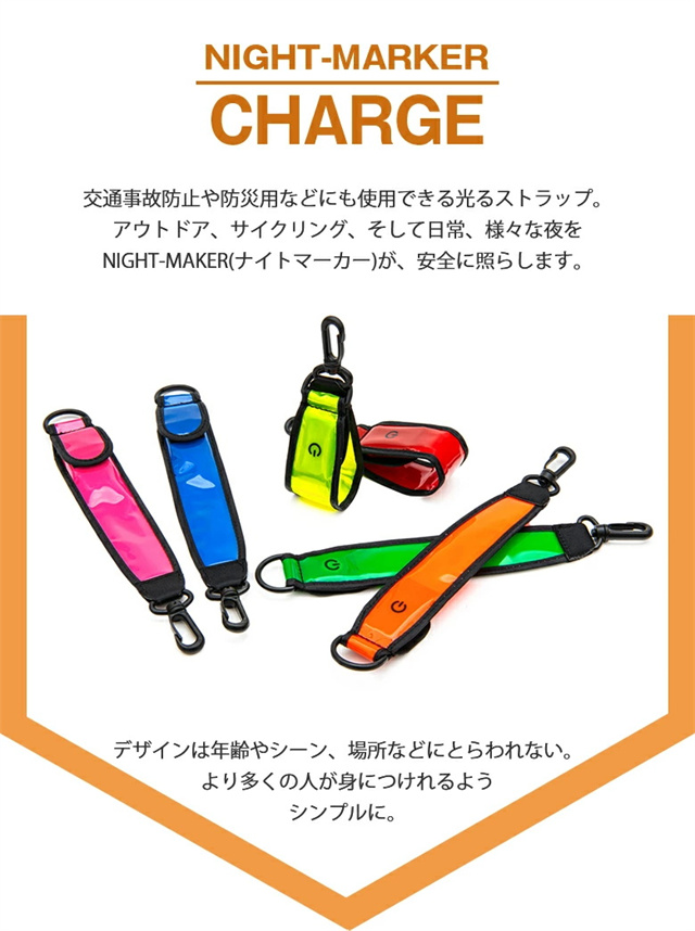 | 説明 | 夜のランニングや自転車におススメの光るストラップ、ナイトマーカー チャージ。 電池交換がない充電式だから経済的。 アウトドア、サイクリング、ランニングなど様々な日常で、夜を安全に照らします。 |