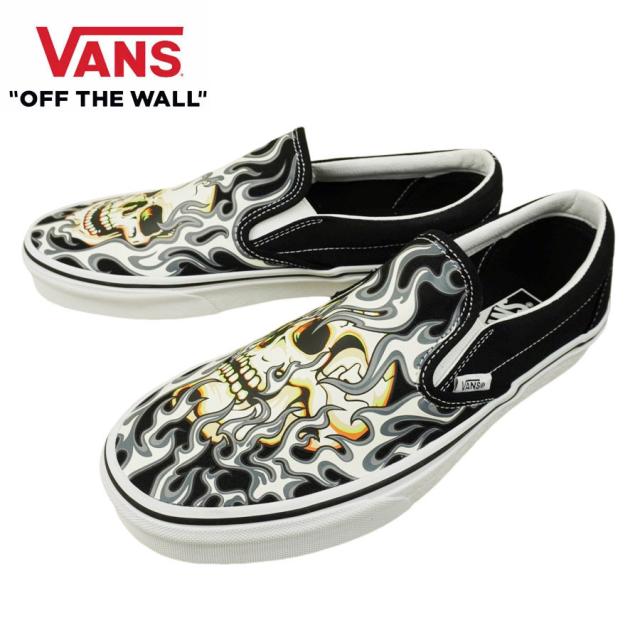 VANS スニーカーVANS ヴァンズ バンズCLASSIC SLIP ON スリッポン スリップオンFLAME SKULL BLACK/TRUE WHITEフレイム スカル ブラック/トゥルーホワイト黒 白 ドクロ 骸骨 炎 ローライダーメンズ レディース スニーカー 靴 紐無