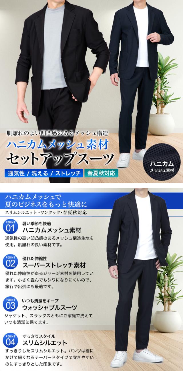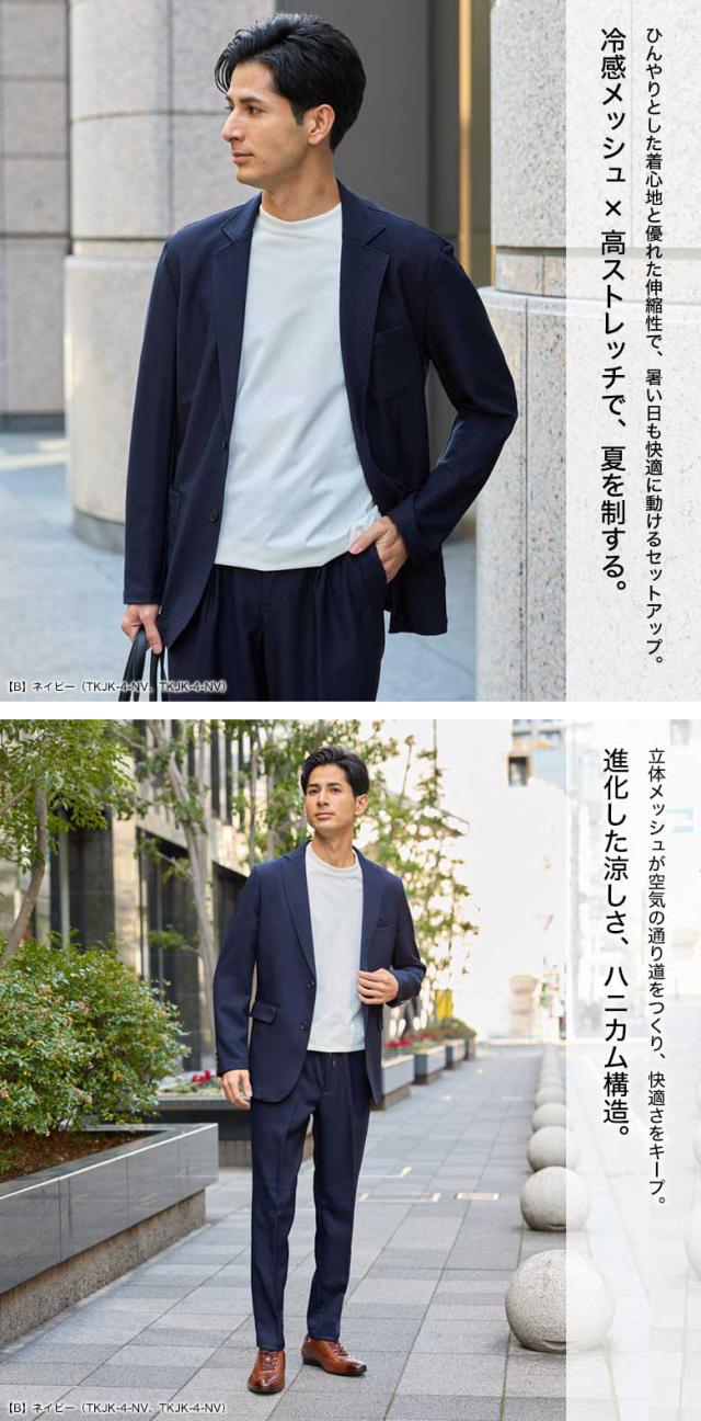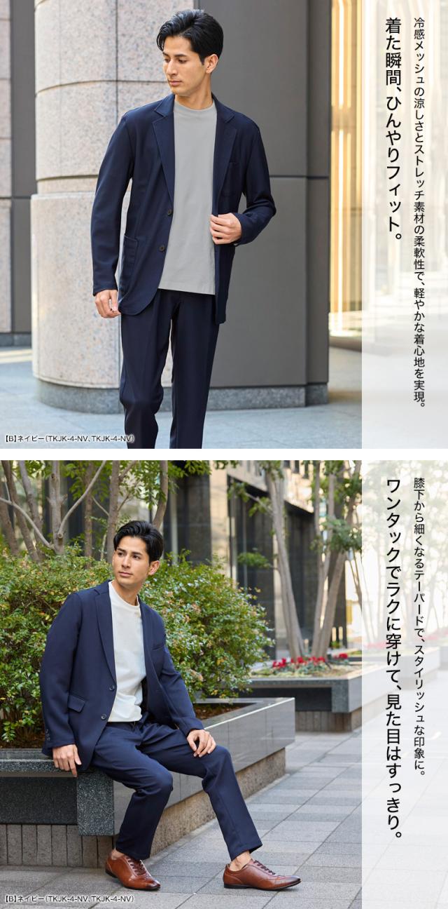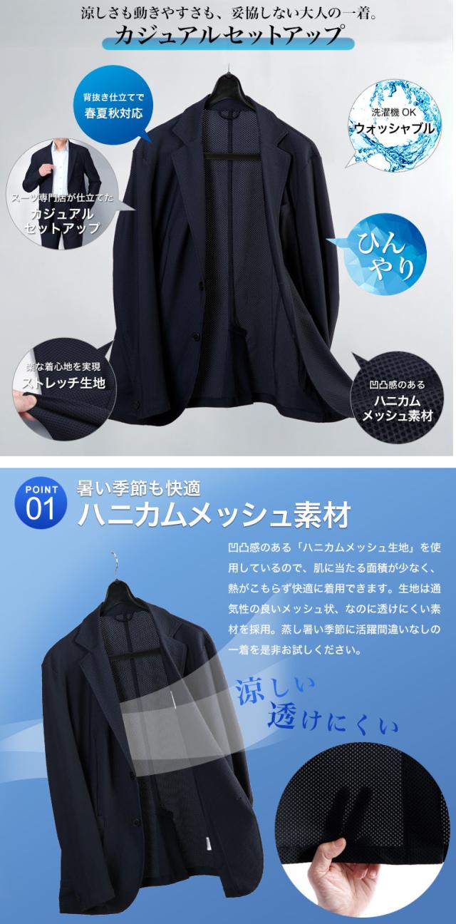冷感 メッシュ ストレッチスーツ カジュアルセットアップ 上下セット スーツ仕立て スリム ワンタック 背抜き メッシュ素材 クール 清涼 涼しい ストレッチ 防シワ 上下洗える ウォッシャブル テーラード テーパード カジュアル ビジネス 春夏秋 おしゃれ リモートワーク