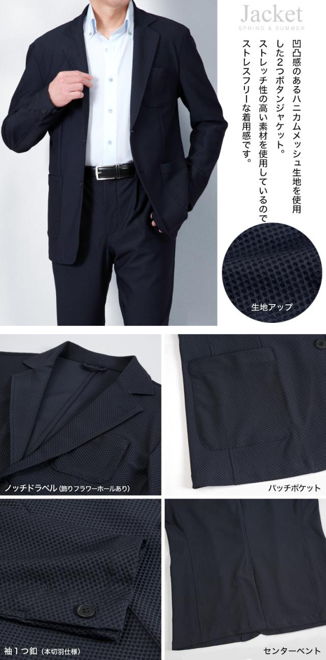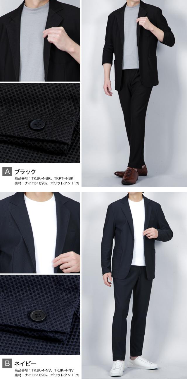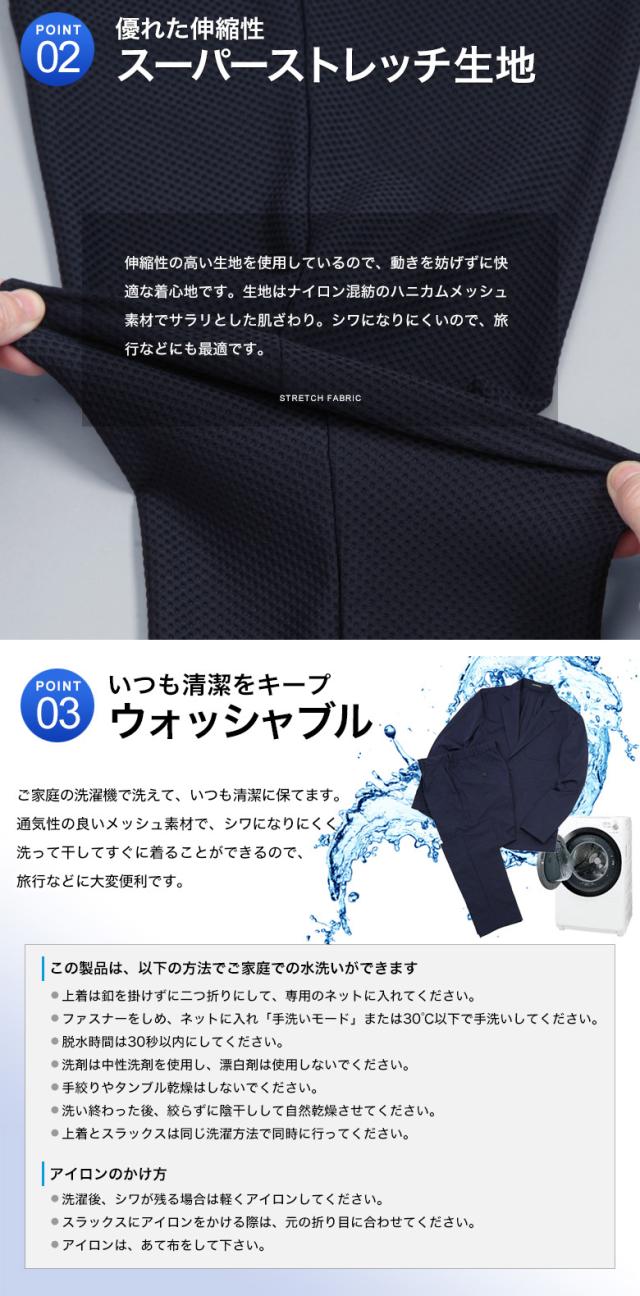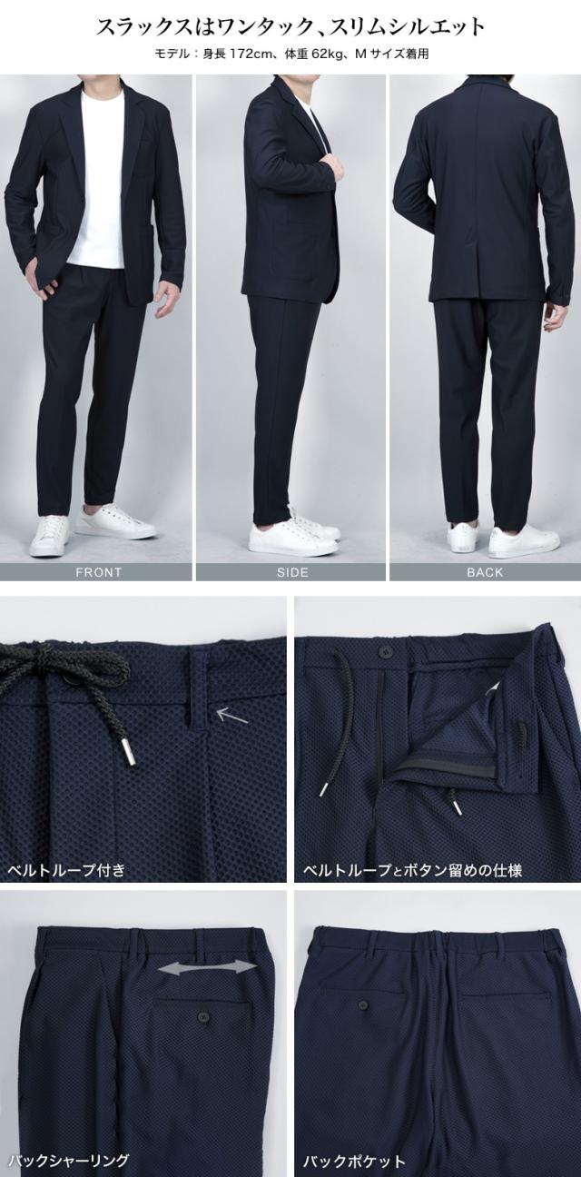 冷感 メッシュ ストレッチスーツ カジュアルセットアップ 上下セット スーツ仕立て スリム ワンタック 背抜き メッシュ素材 クール 清涼 涼しい ストレッチ 防シワ 上下洗える ウォッシャブル テーラード テーパード カジュアル ビジネス 春夏秋 おしゃれ リモートワーク