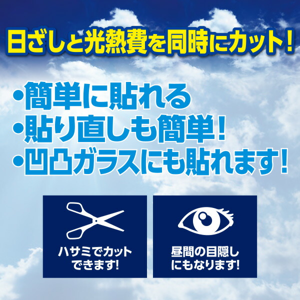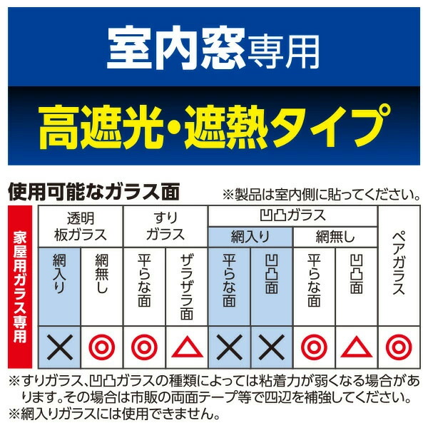 | 商品説明 | ●カラーは「ブラウン」「ブラック」の2色展開 ●45×180cmサイズが2枚で1セットになります ●貼りやすく、目線のみ隠したいときにも最適 ●目線、日射し、光熱費を同時にカット ●貼り直しも簡単で何度でも使える(※長時間使用後の貼り直しは出来ません) ●凹凸ガラスにも貼れます ●断熱効果で冷房効率UP 【ブラウン】 ●遮光率:約75% ●紫外線カット:約70% ●遮熱効果:約35% 【ブラック】 ●遮光率:約90% ●紫外線カット:約90% ●遮熱効果:約40% |
