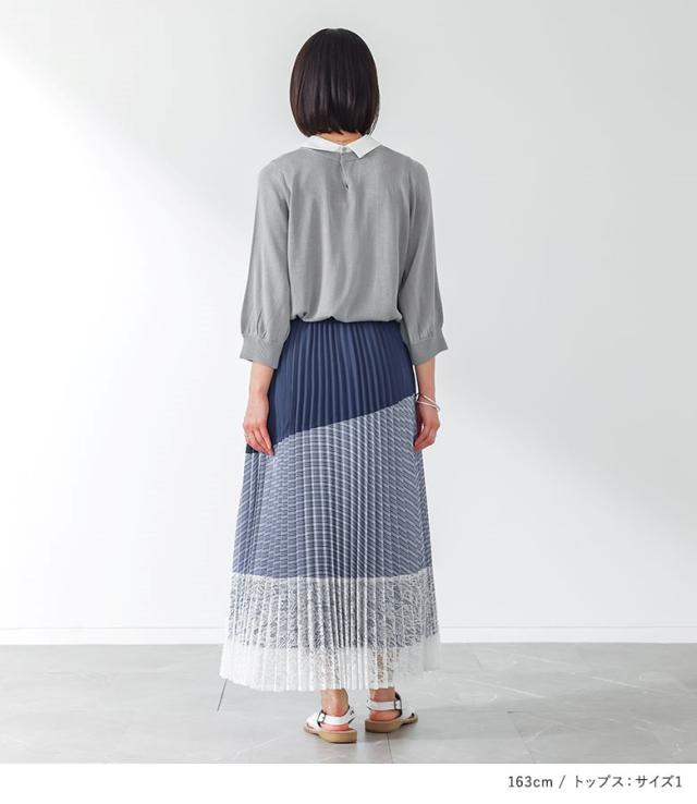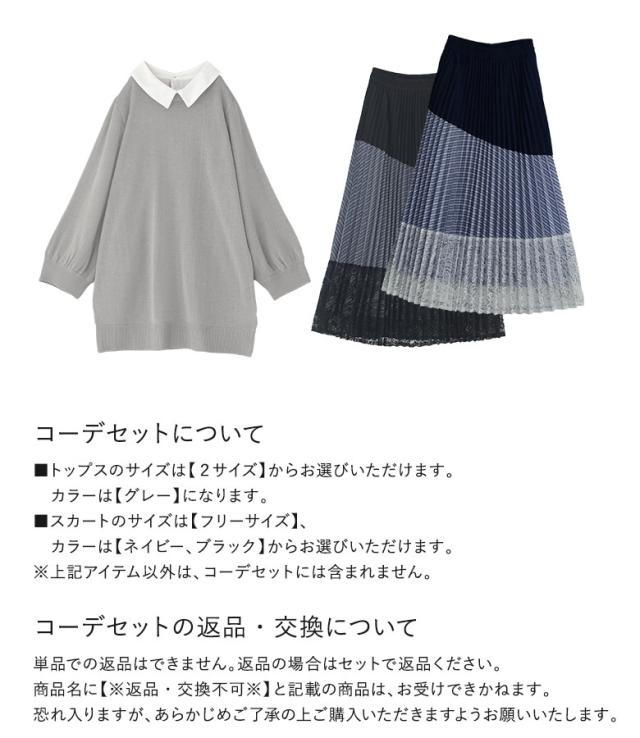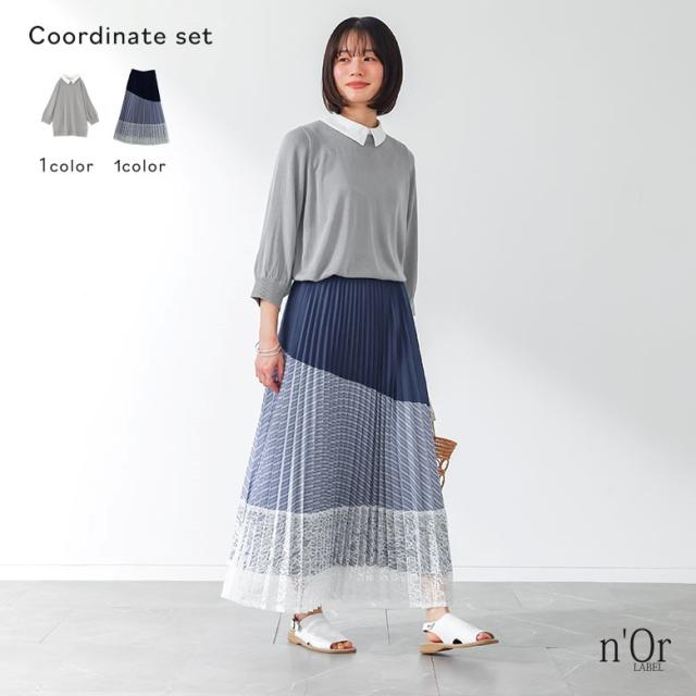 『異素材プリーツ切替スカート×シャツ襟ドッキングニットプルオーバーコーデ2点SET』【メール便不可】【40】[2点コーデセット 2026 レディース スカート ロング丈 プリーツスカート ニット 七分袖 サマーニット]