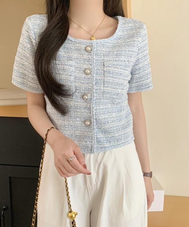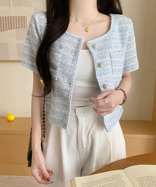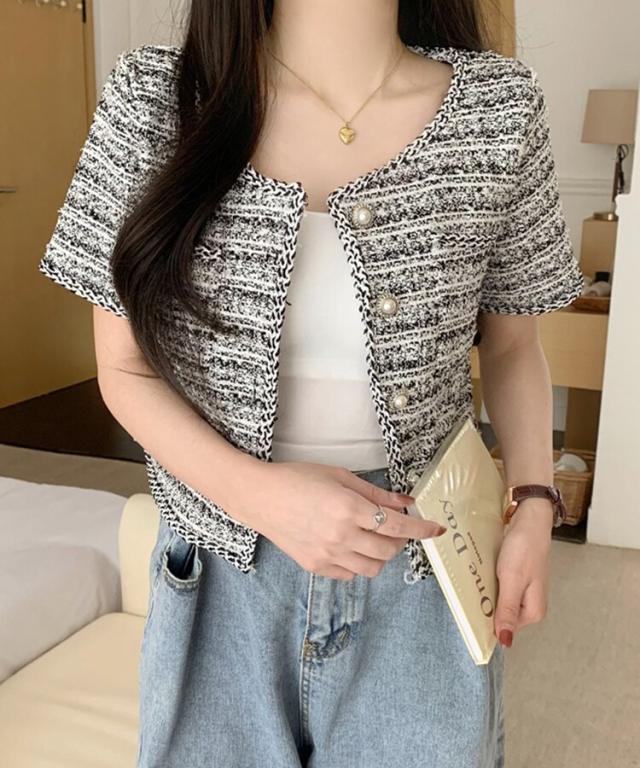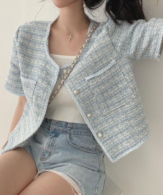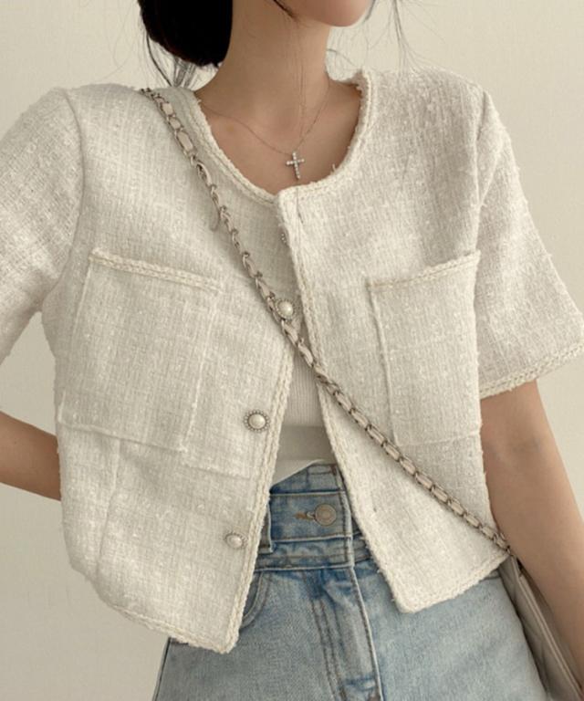 パールボタンツイード半袖ノーカラージャケット