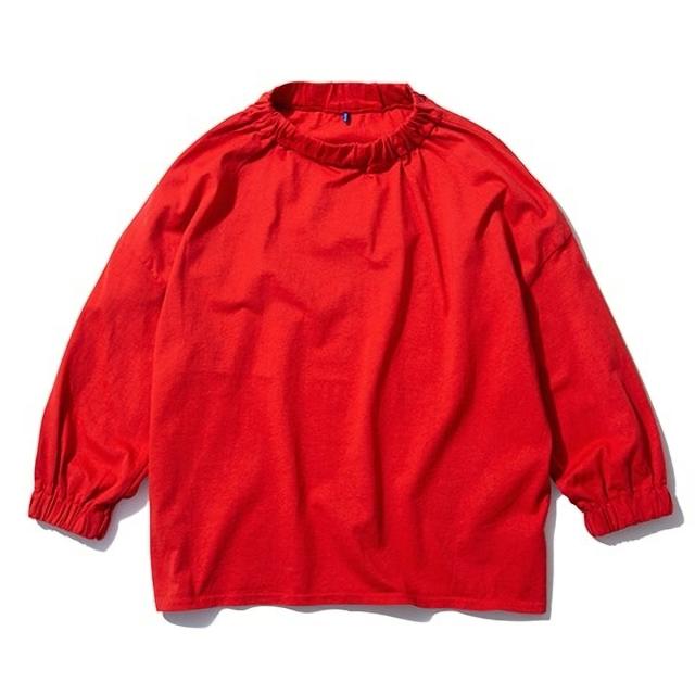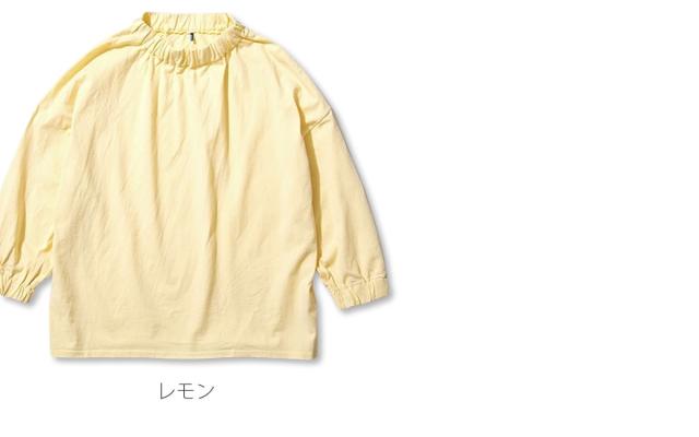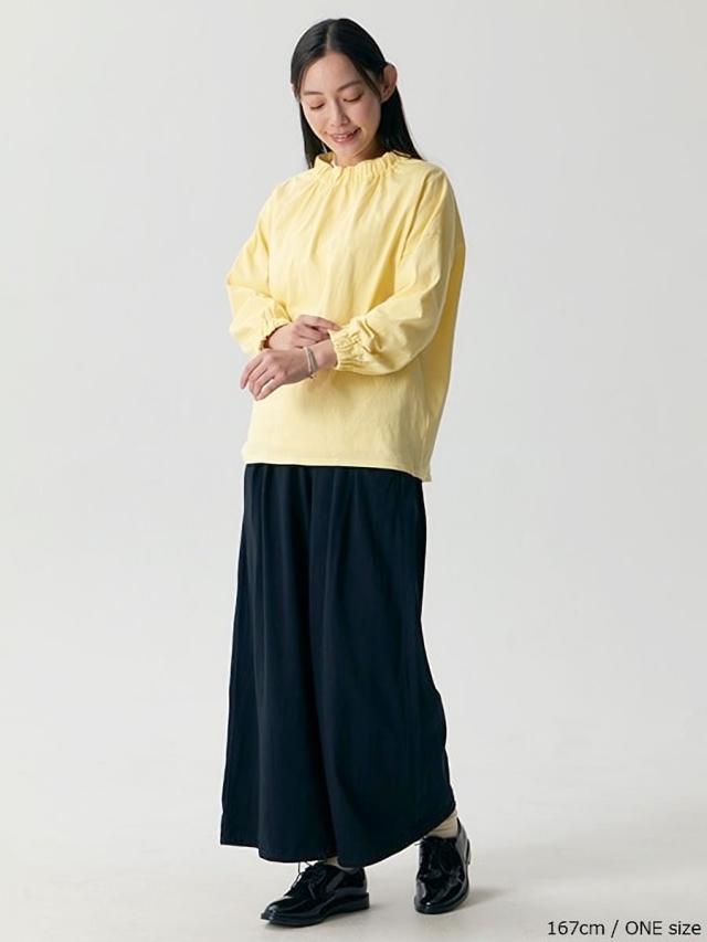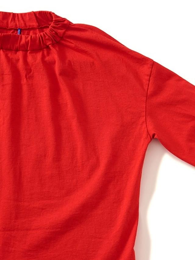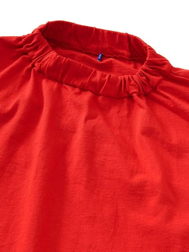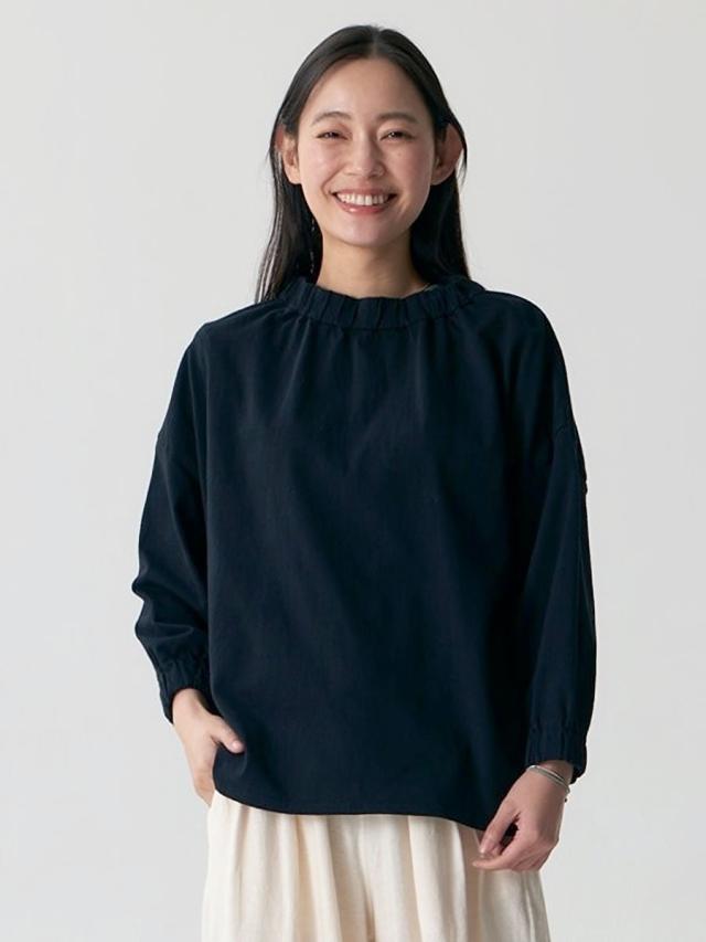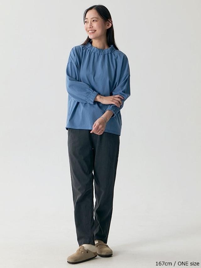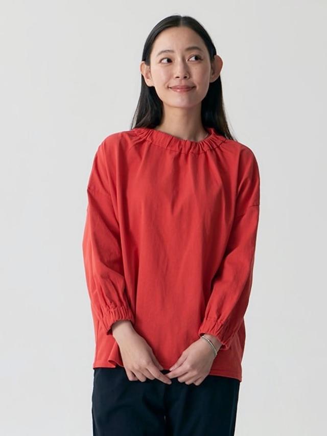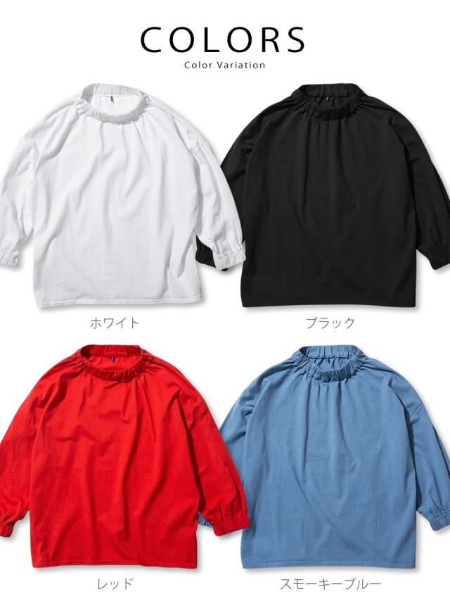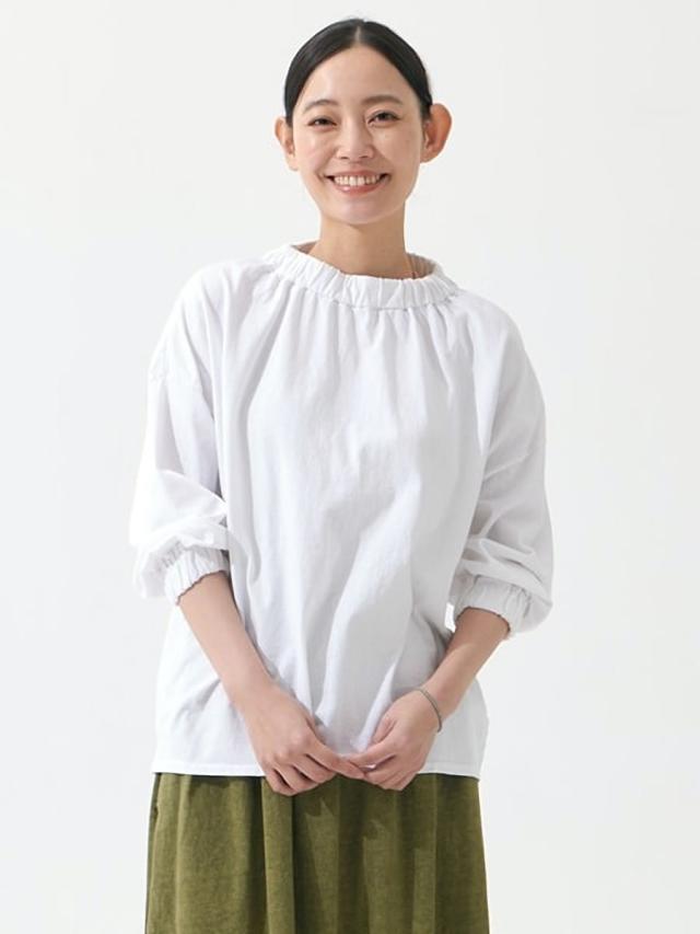 袖丈には抜け感のある七分袖デザインを採用することで、季節の変わり目でも快適に着用でき、手首をすっきりと見せながら軽やかなシルエットを演出します。また、首元と袖口にはさりげないギャザー加工を施しており、シンプルなTシャツに程よいボリューム感と立体的なアクセントを加えることで、女性らしい柔らかな表情を引き立てています。
