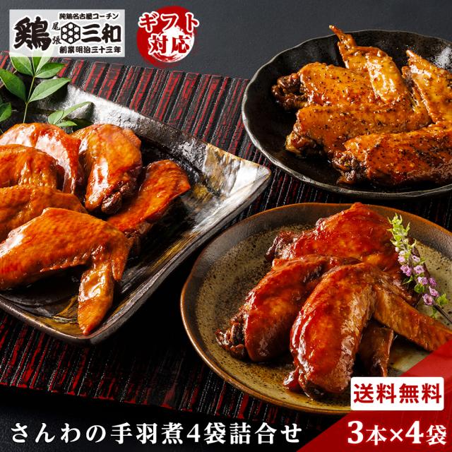 【さんわの手羽煮4袋詰合せ(合計12本)】手羽煮 手羽先煮込み 冷凍 送料無料 お取り寄せ グルメ 名古屋名物 惣菜 おかず おつまみ 国産鶏肉 簡単調理 ギフト 贈答 お歳暮 お中元 お土産 鶏三和