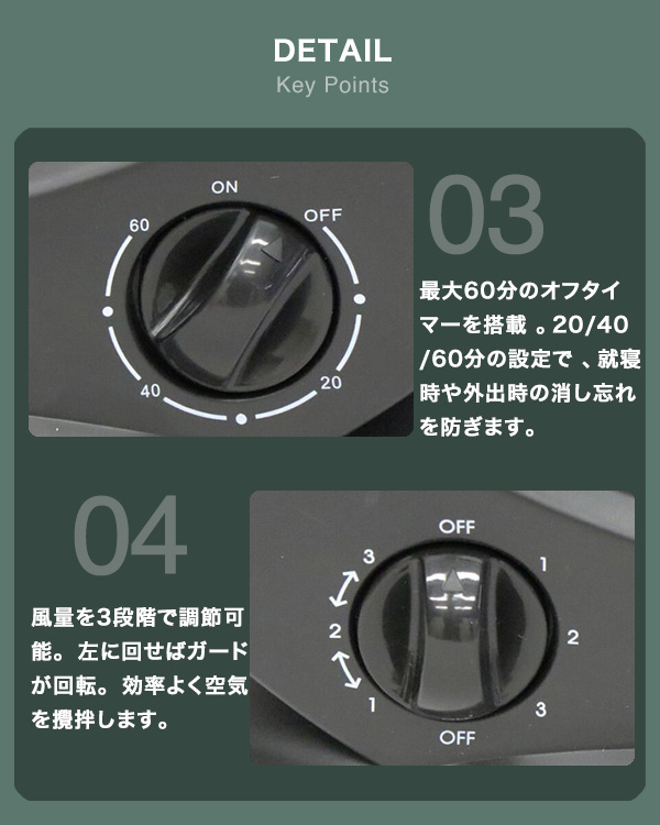 風量は弱・中・強の3段階切替。操作はつまみを回すだけで、右に回すと通常送風、左に回すとガードが回転して風を撹拌します。