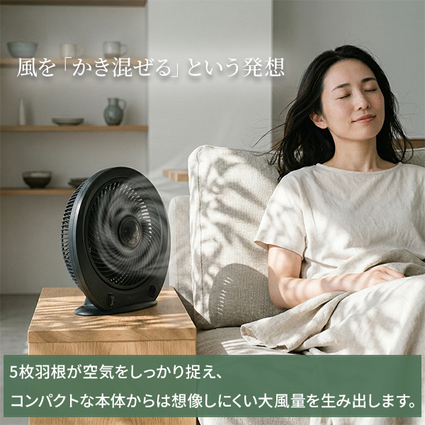 5枚羽根が空気をしっかり捉え、コンパクトな本体からは想像しにくい大風量を生み出します。