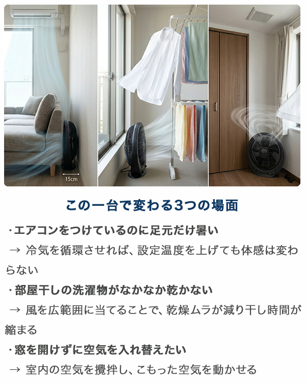 ・窓を開けずに空気を入れ替えたい → 室内の空気を攪拌し、こもった空気を動かせる