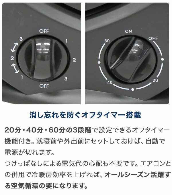 20分・40分・60分の3段階で設定できるオフタイマー機能付き。