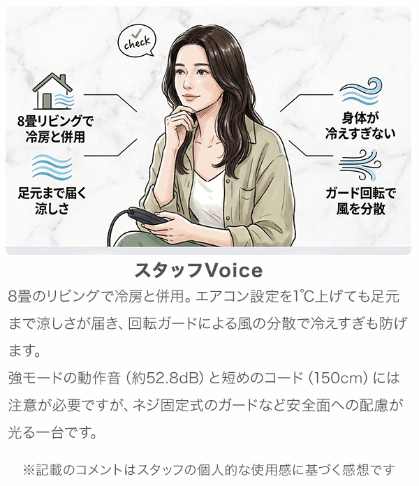 ・首振り機能について:左右への自動首振り機能はありません。前面ガードの回転によって風を拡散させる方式です。特定の方向に集中して風を送りたい用途には向いていません。