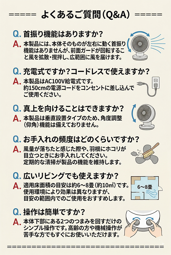 A. 本体そのものが左右に動く首振り機能はありませんが、前面ガードが回転することで風を拡散・撹拌し、広範囲に風を届けます 。