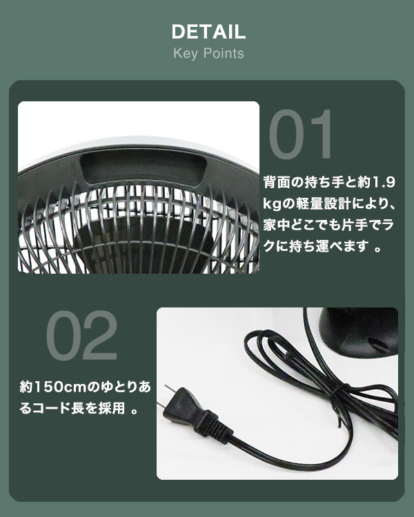 ・冷風機能について:風自体を冷やす機能はありません。空気の循環と送風を目的とした製品です。エアコンなしで室温を下げることはできません。