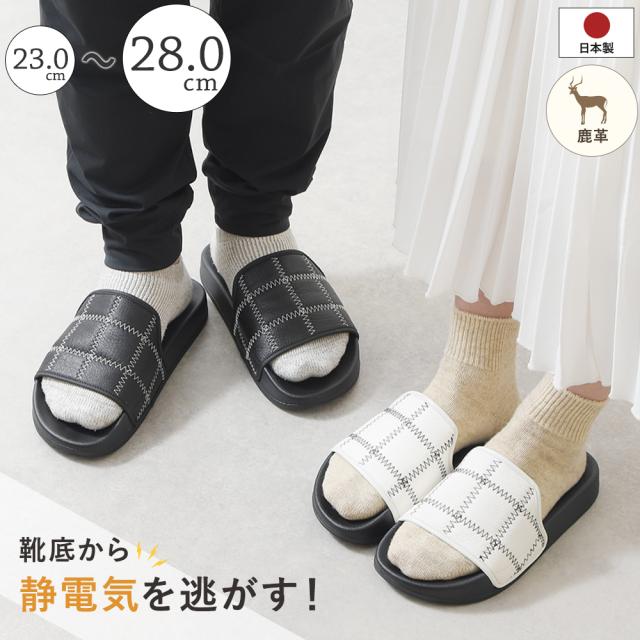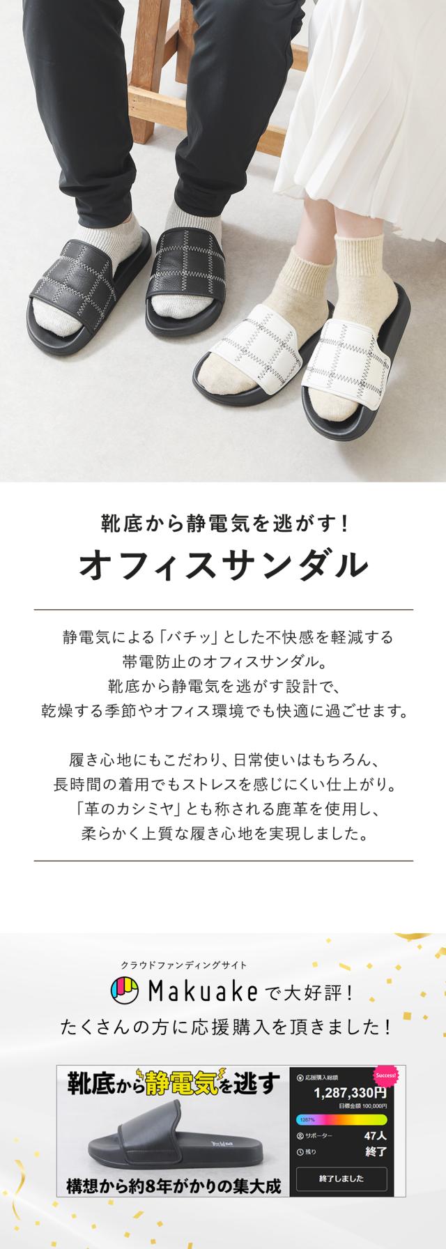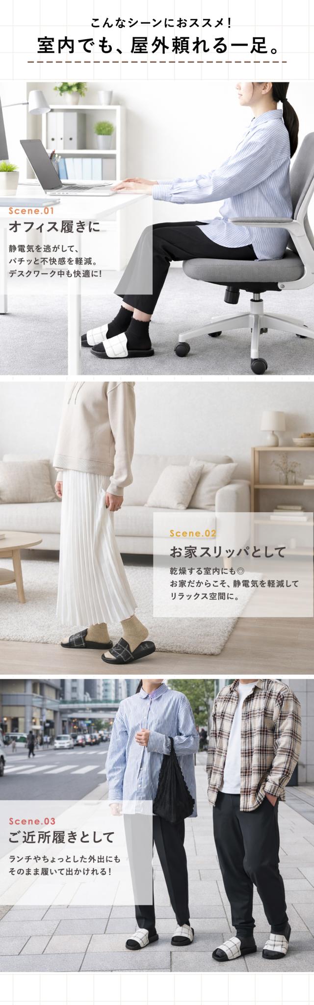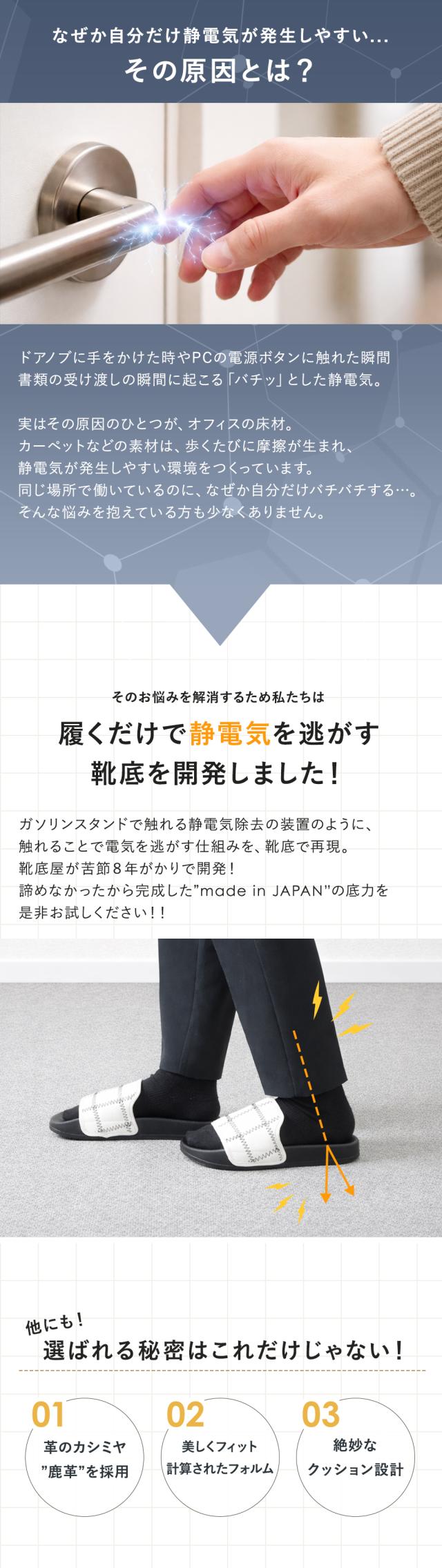 静電気による「バチッ」とした不快感を軽減する、つっかけタイプのオフィスサンダル。