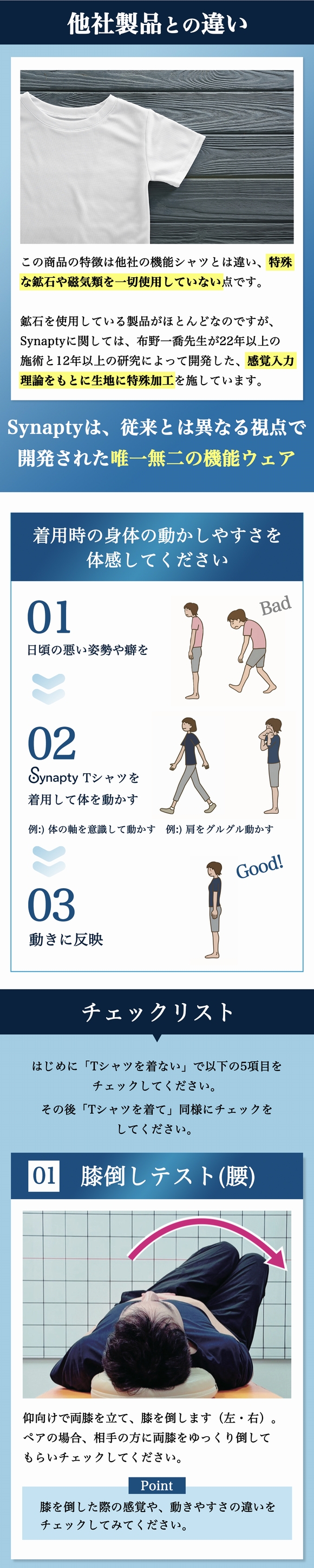Synapty シナプティ コンディショニングウェア 機能ウェア 日本製 Tシャツ バランス 体幹サポート 自然な着心地 鉱石不使用 安心設計 ユニセックス 男女兼用 布野一喬 ふの かずたか 送料無料 全3色 ホワイト ブラック ネイビー