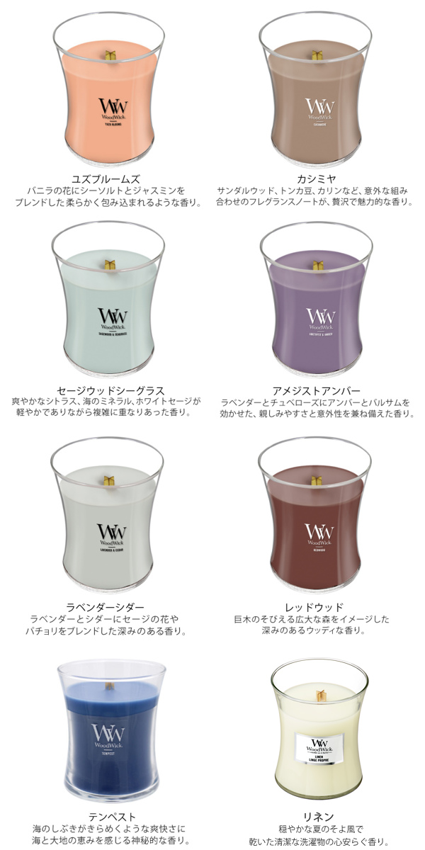 | 種類 | ラベンダースパ、ホワイトティー&ジャスミン、コースタルサンセット、イブニングバンファイア、バニラシーソルト、ホワイトチーク、ウォームウール、マグノリアバーチ、ユズブルームズ、カシミヤ、セージウッドシーグラス、アメジストアンバー、ラベンダーシダー、レッドウッド、テンペスト、リネン |