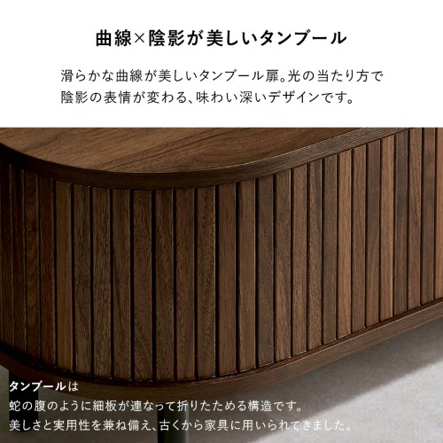 | 【商品紹介】 縦のラインとサイドの曲線が美しいタンブール扉のテレビ台。扉の開閉に場所を取らず、すっきりとした脚高デザインもポイントです。ローボードとしても使用可能 |