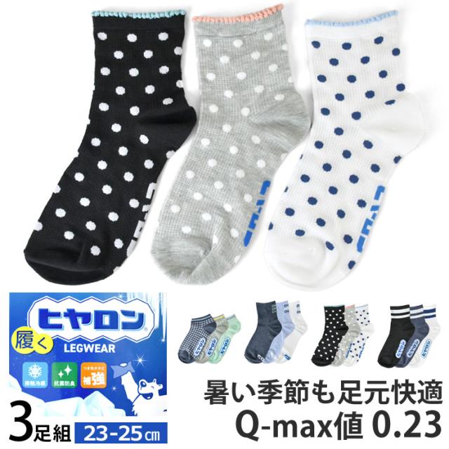 ヒヤロン 靴下 レディース 婦人 3足組 接触冷感 抗菌防臭 つま先かかと補強 Q-max 0.23 選べる2丈【A4Q】【送料無料】【メール便1】 春新作