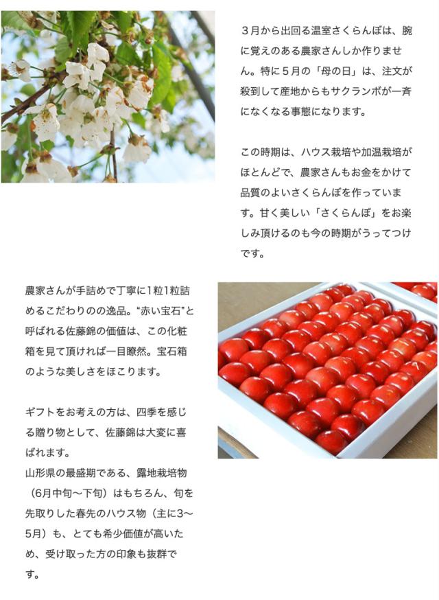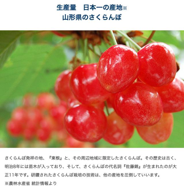 さくらんぼの代名詞とも言える「佐藤錦」。その国内生産量の約70%を占める山形県でもトップクラスの生産量を誇る東根・村山・天童などから、その年の出来が良いさくらんぼを現地協力会社と連携して優先的に集めます。上質な甘みと繊細な果肉、ルビーを思わせる美しさを併せ持つ佐藤錦は日本が世界に誇るまさに芸術品です。