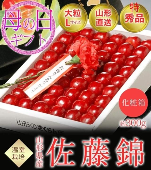 母の日ギフト 佐藤錦 山形県産 温室さくらんぼ Lサイズ 特秀品 約300g 化粧箱 ※常温 カーネーション(造花)・メッセージカード付 産地直送 送料無料