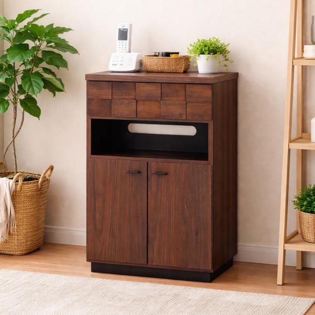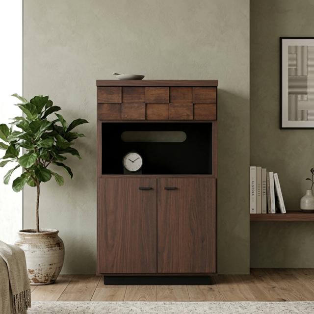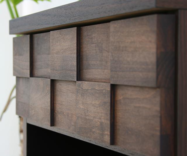 前板にはアルダー無垢材を使用し、厚みの異なる凹凸デザインが立体感のある表情を演出します。深みのある木目が上質な雰囲気を生み出し、滑らかな質感に仕上がっています。