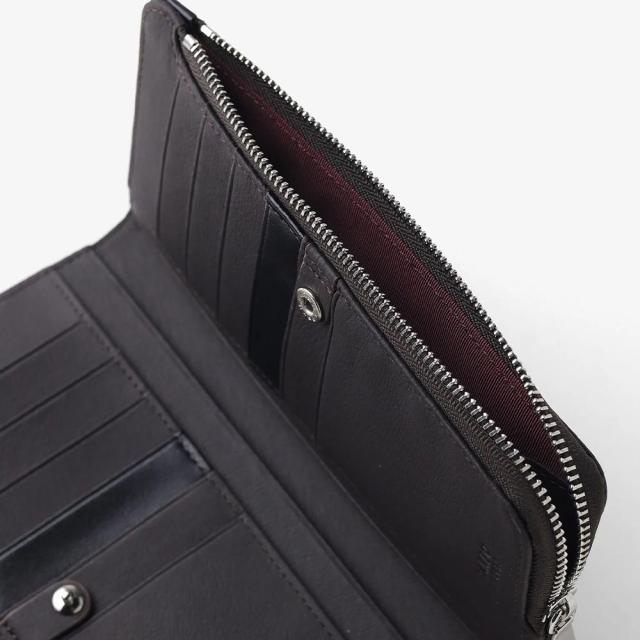 本体素材には、アニリン仕上げによる透き通るような透明感が特徴のキップ調レザーを使用。小さめのスクエア型ロゴプレートは、さりげないながらも存在感があり高級感を高めています。