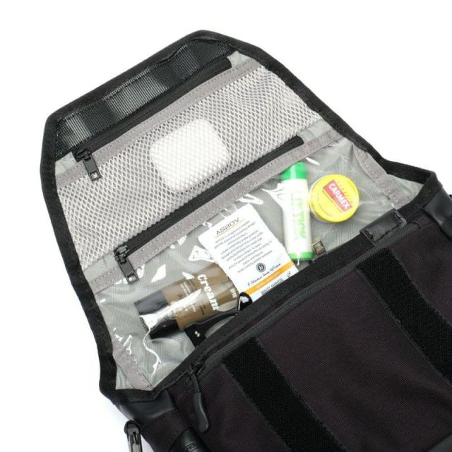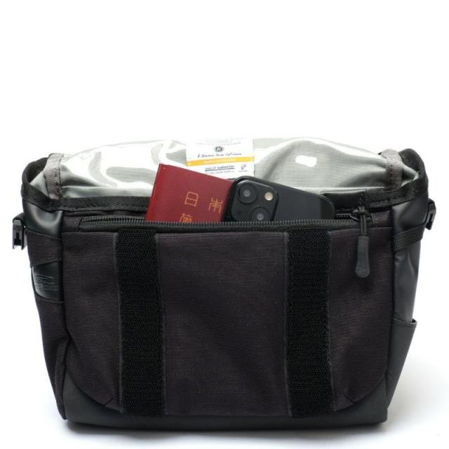 ・フラップ部分には隠しフックを内蔵し旅先で吊り下げて使用することが可能。 フックが使えないようなバーにも、正面のループを使って吊り下げが可能です。