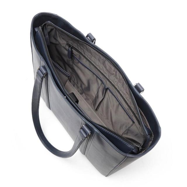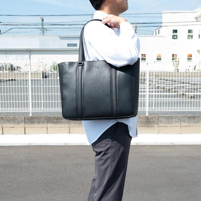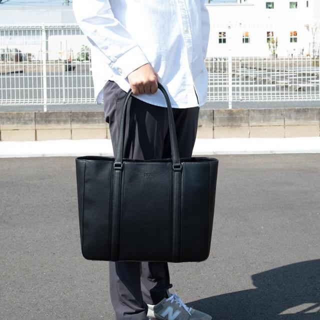 内装にはPCポケットやペットボトルホルダー、小物ポケット、ペンホルダーなどのビジネスバッグに必要不可欠な収納機能が充実しており、外装はオールレザーのシンプルで落ち着いた雰囲気に仕上げているため、ビジネスシーンに馴染みます。