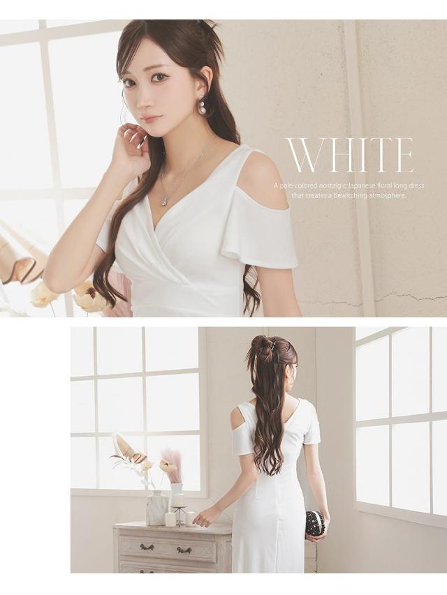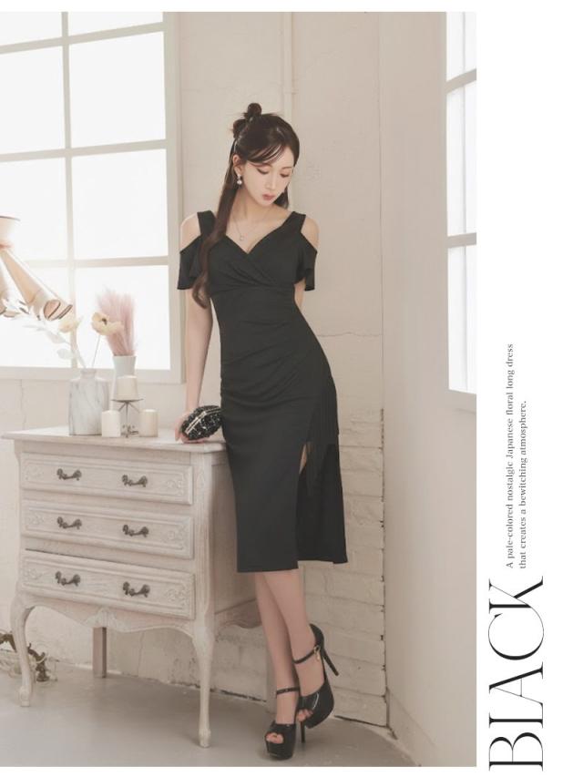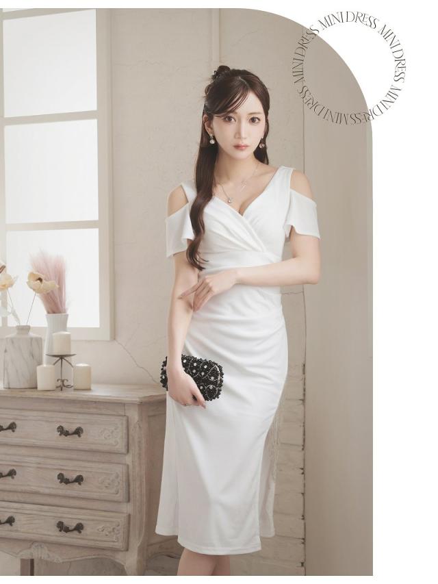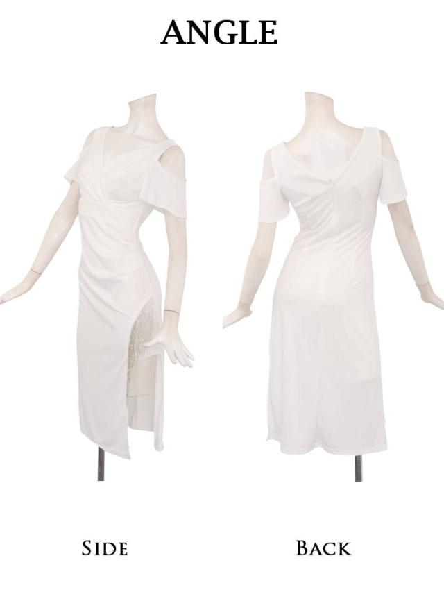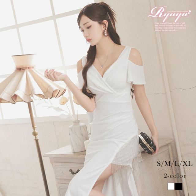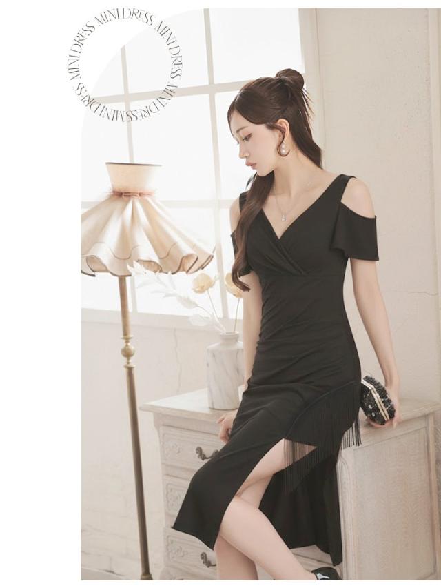 ミニドレス Ryuyu ビジューフリンジ付き カシュクール 膝丈 カットショルダー ストレッチ キャバ ドレス キャバドレス