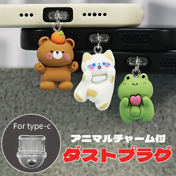 【TYPE-C】タイプC アニマル チャーム付き 防塵 ダストプラグ スマートフォン スマホ タブレット 携帯電話 充電 ポート 端子 カバー キャップ iPhone android クマ 猫 ネコ カエル ほこり防止イヤホンケース ゲーム機 Switch アクセサリー デコレーション 可愛い