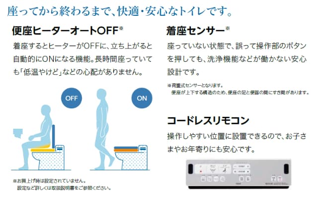 強力な脱臭機能搭載。便座ヒーターオートOFFで長時間でも安心。