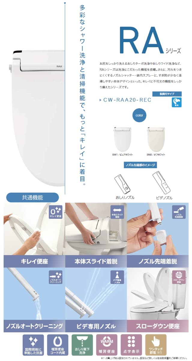 LIXIL シャワートイレ RAシリーズ CW-RAA20-REC BN8(オフホワイト) BW1(ピュアホワイト) リクシル INAX イナックス 温水洗浄便座 抗菌加工 ビデ専用ノズル 脱臭機能付き 瞬間式 暖房便座 リモコン付き おまかせ節電