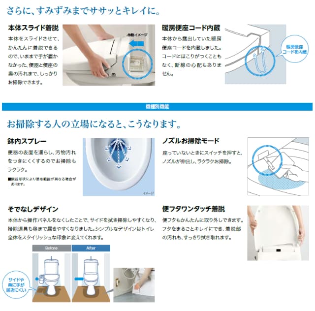 かんたんにお掃除できる、キレイ便座、簡単着脱。