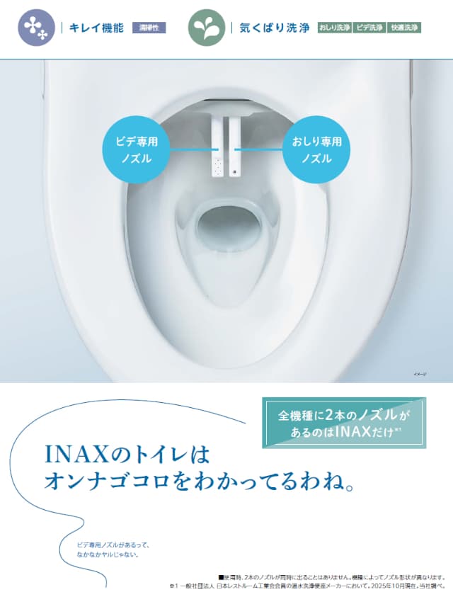 ・ビデ専用ノズル搭載。女性にやさしい安心の清潔設計。