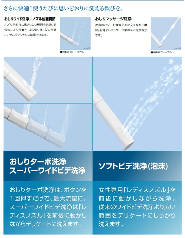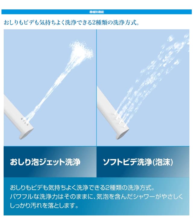 おしり用とビデ用、別々のノズルで清潔・安心。2種類の洗浄方式や快適に洗える機能搭載。