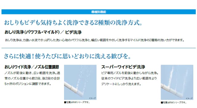 おしり用とビデ用、別々のノズルで清潔・安心。2種類の洗浄方式や快適に洗える機能搭載。
