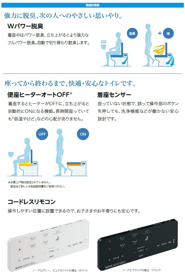 ・Wパワー脱臭で強力脱臭!着座センサー搭載で安心。