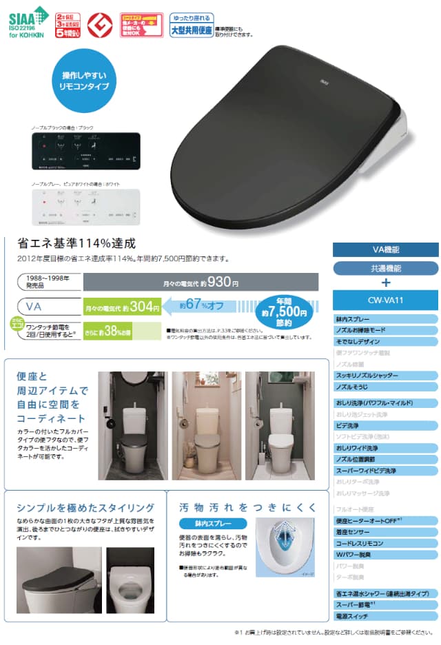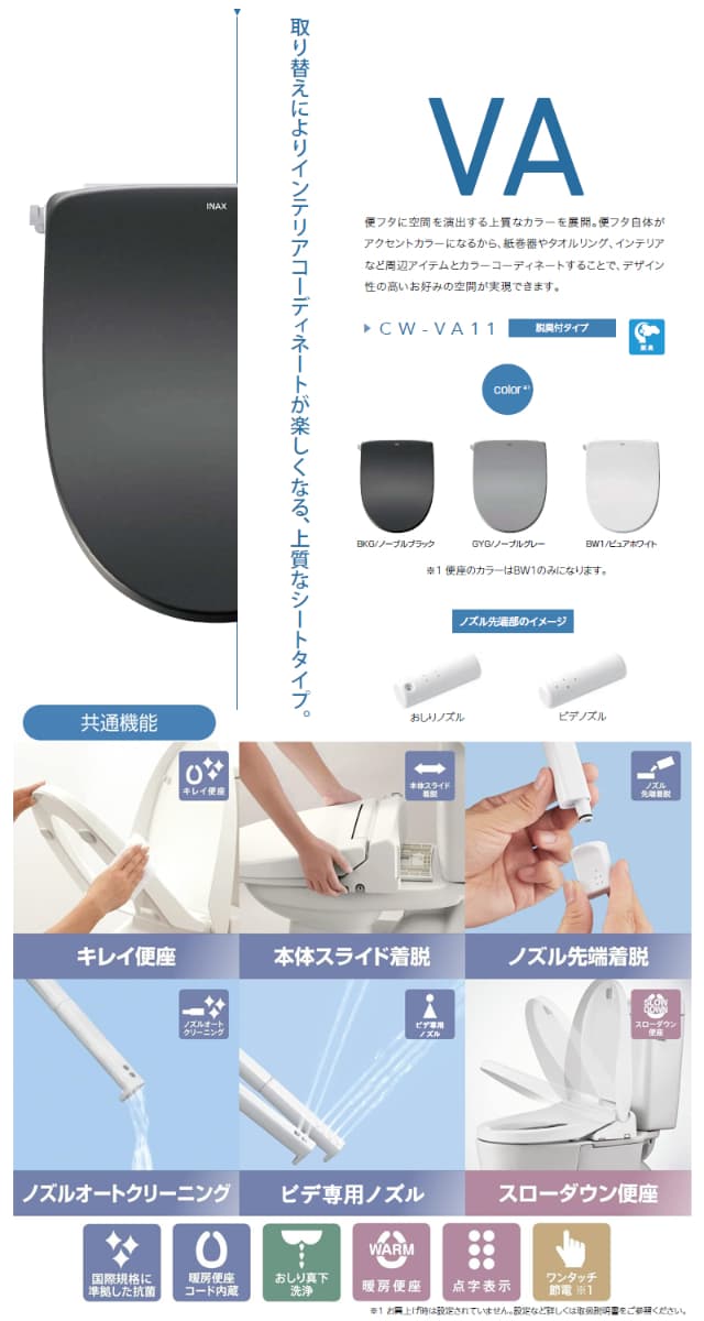 LIXIL シャワートイレ VAシリーズ CW-VA11 BW1(ピュアホワイト) BKG(ノーブルブラック) GYG(ノーブルグレー) リクシル INAX イナックス 温水洗浄便座 抗菌加工 ビデ専用ノズル 脱臭機能付き 瞬間式 暖房便座 リモコン付き おまかせ節電