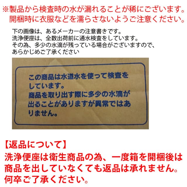 洗浄便座は衛生商品の為、一度箱を開梱後は商品を出していなくても返品は承れません。何卒ご了承ください。あらかじめ製品仕様をよくご確認の上でご注文下さいますようお願いいたします。