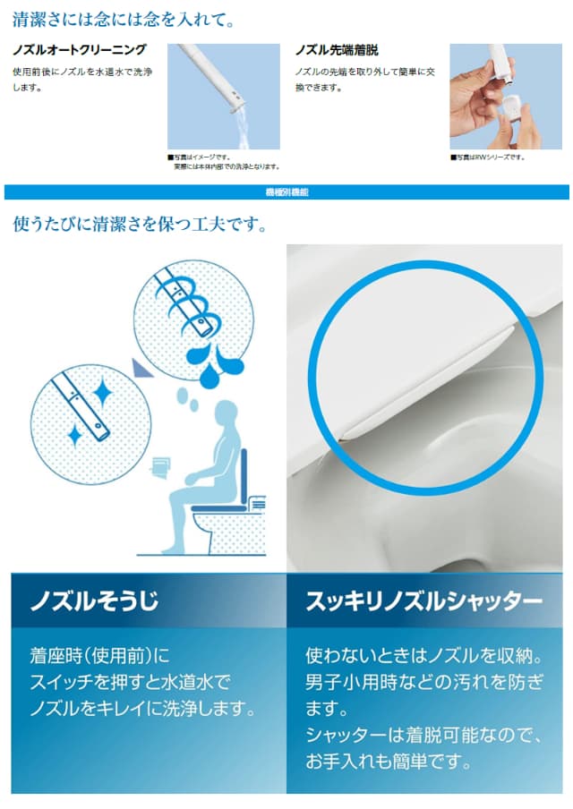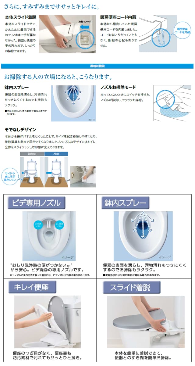 かんたんにお掃除できる、キレイ便座、簡単着脱。