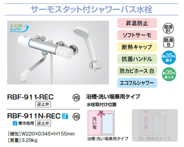 LIXIL サーモスタット付シャワーバス水栓 RBF-911-REC/911N-REC リクシル INAX イナックス エコフルシャワー 断熱キャップ 抗菌ハンドル 節水 省エネ 一般地用 寒冷地用 浴室水栓金具 蛇口