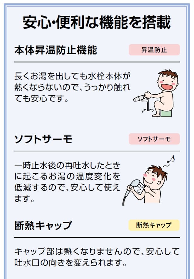- 一時止水後のお湯の温度変化を軽減するソフトサーモ。
