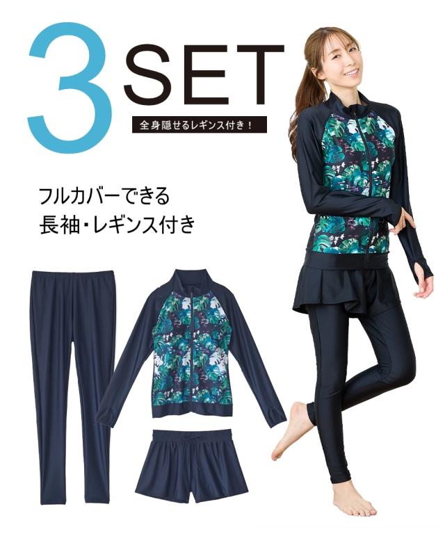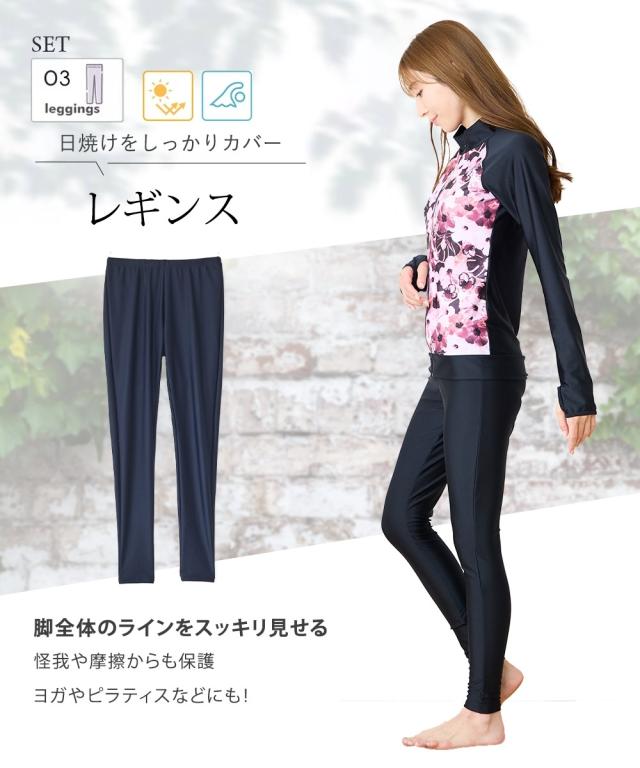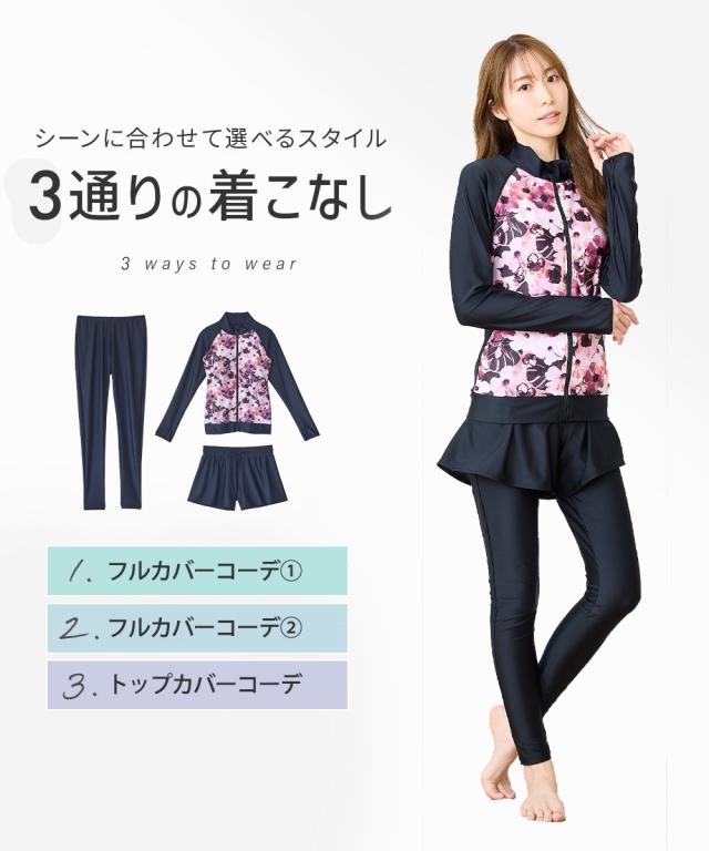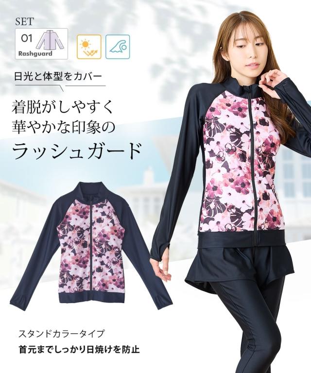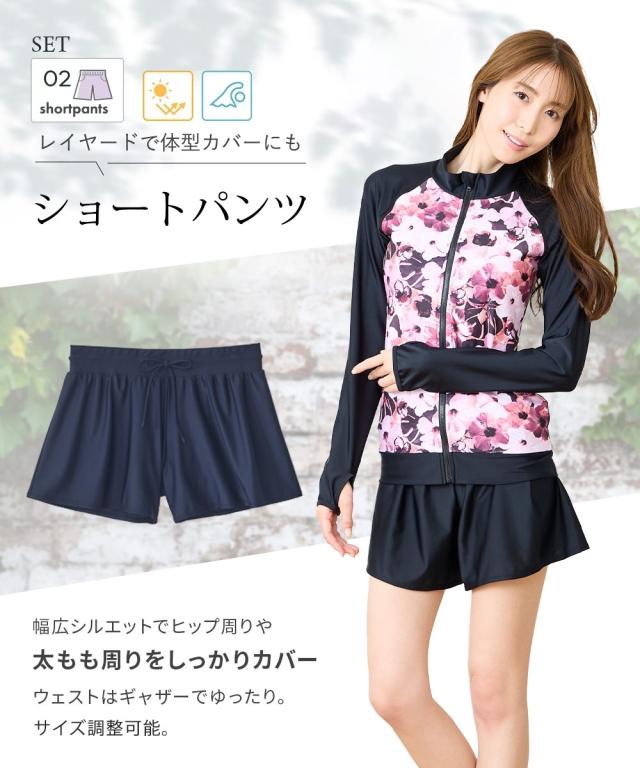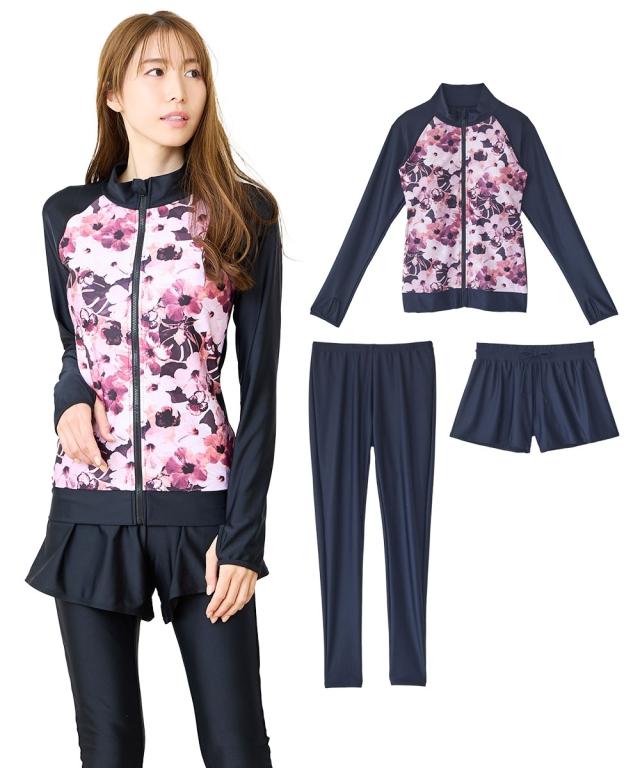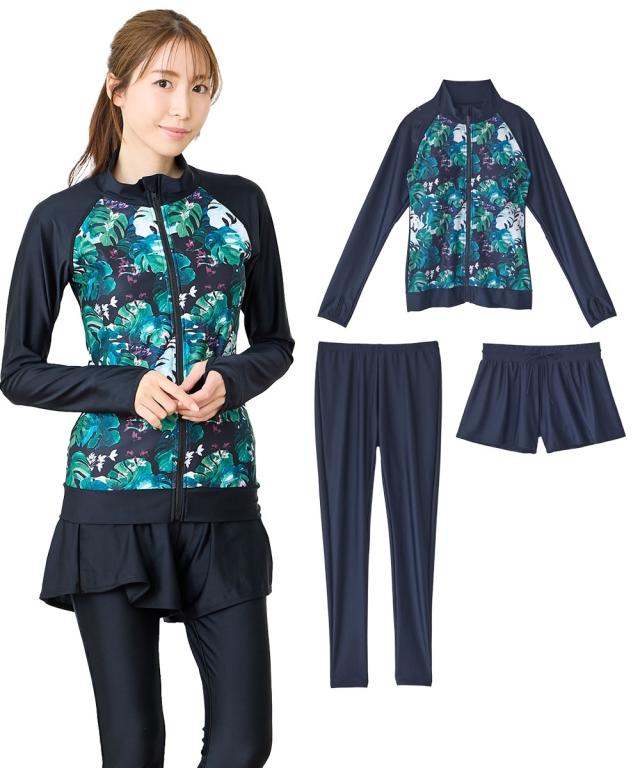 見せたくないところを、美しく隠す。 華やかプリントが主役の機能派フィットネス。 自信をまとう、大人の3点セット水着。 ■デザイン 視線を惹きつける華やかなボタニカル・フラワー柄をフロントに配置し、 サイドや袖をダークカラーで引き締めることで、視覚的な着痩せ効果を演出しています。 セット内容は「長袖ラッシュガード」「ショートパンツ」「1レギンス」の3点。 シーンに合わせて3通りの着こなしが楽しめるのが最大の魅力です。 ・フルカバー: 絶対に焼きたくない日や、体型をまるごとカバーしたい時に。 ・フルカバー(スタイリッシュ): レギンスとラッシュガードのみですっきりと。 ・トップカバー: アクティブに動きたい時や、足元を軽やかに見せたい時に。 首元までしっかりガードするスタンドカラーや、ヒップラインを隠す絶妙な丈感のフレアパンツなど、 大人の女性が抱える「露出への抵抗感」に寄り添った設計です。 ■素材 伸縮性に優れたポリエステル・ポリウレタン混紡素材を採用。 体に柔らかくフィットし、激しい動きでもストレスを感じさせない高いストレッチ性を誇ります。 また、吸汗速乾性に優れているため、水中から上がった後の冷えを軽減し、 陸上でのヨガやフィ