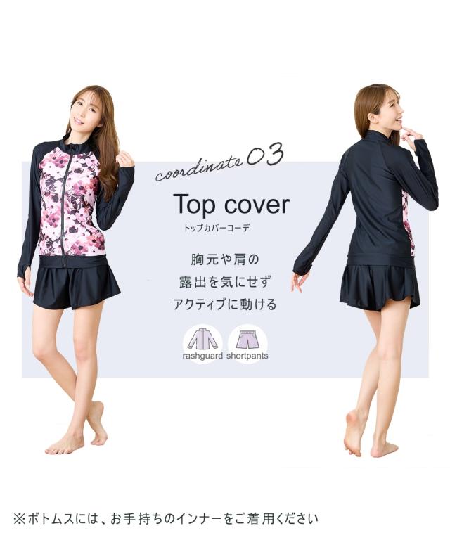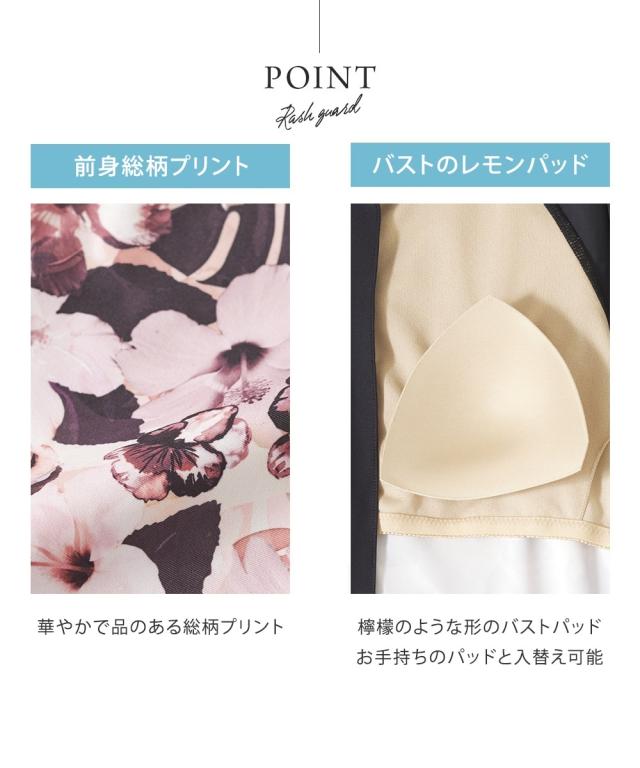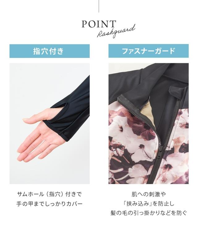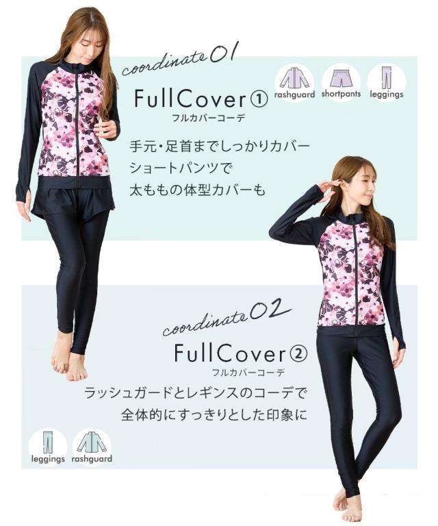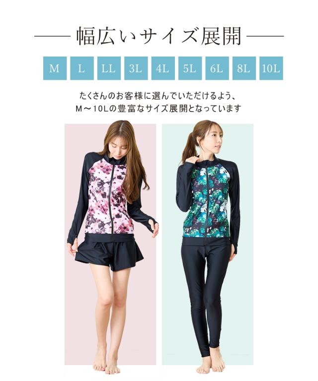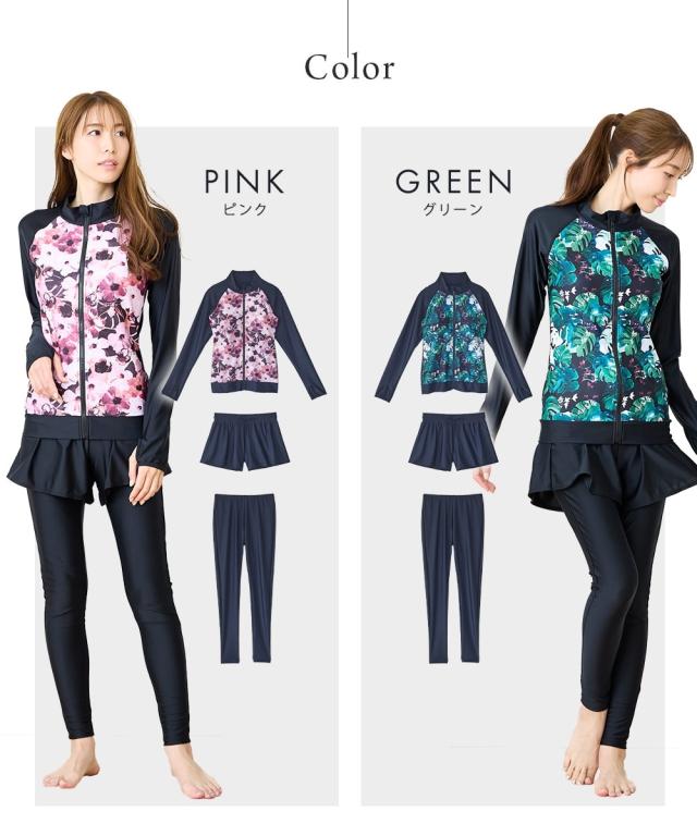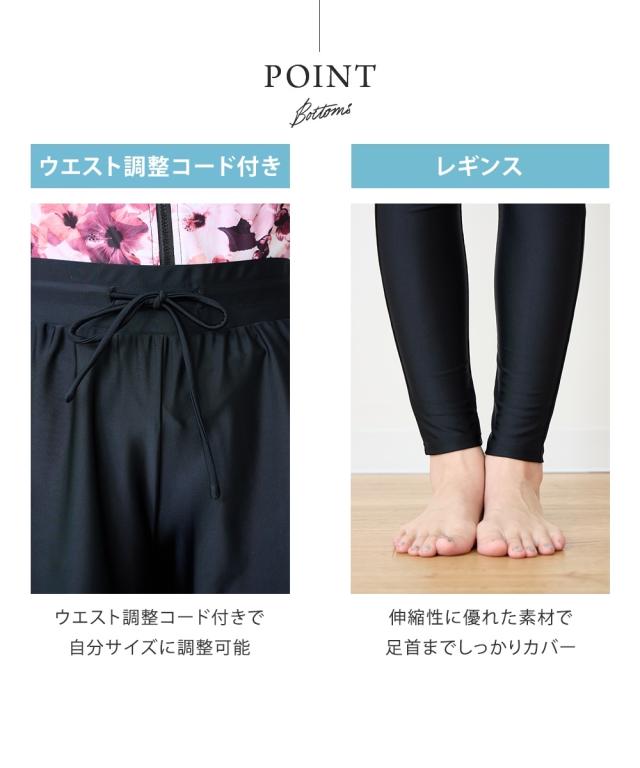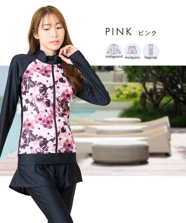 見せたくないところを、美しく隠す。 華やかプリントが主役の機能派フィットネス。 自信をまとう、大人の3点セット水着。 ■デザイン 視線を惹きつける華やかなボタニカル・フラワー柄をフロントに配置し、 サイドや袖をダークカラーで引き締めることで、視覚的な着痩せ効果を演出しています。 セット内容は「長袖ラッシュガード」「ショートパンツ」「1レギンス」の3点。 シーンに合わせて3通りの着こなしが楽しめるのが最大の魅力です。 ・フルカバー: 絶対に焼きたくない日や、体型をまるごとカバーしたい時に。 ・フルカバー(スタイリッシュ): レギンスとラッシュガードのみですっきりと。 ・トップカバー: アクティブに動きたい時や、足元を軽やかに見せたい時に。 首元までしっかりガードするスタンドカラーや、ヒップラインを隠す絶妙な丈感のフレアパンツなど、 大人の女性が抱える「露出への抵抗感」に寄り添った設計です。 ■素材 伸縮性に優れたポリエステル・ポリウレタン混紡素材を採用。 体に柔らかくフィットし、激しい動きでもストレスを感じさせない高いストレッチ性を誇ります。 また、吸汗速乾性に優れているため、水中から上がった後の冷えを軽減し、 陸上でのヨガやフィ