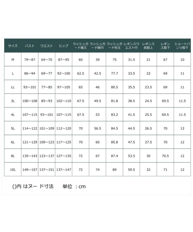 ●セット数:3(ラッシュガード、ショートパンツ、レギンス) ●適応年齢:10代〜 ●品質:ポリエステル・ポリウレタン ●バストカップ取外し:あり ●ラッシュガード指穴:あり ●伸縮性:あり ●直ばき:レギンス:可 ●季節:春・夏・秋向き ※ブラカップに記載されている記号は水着のサイズ記号ではありません。 原産国:中国製 備考:手洗い ()内はヌード寸法