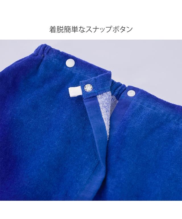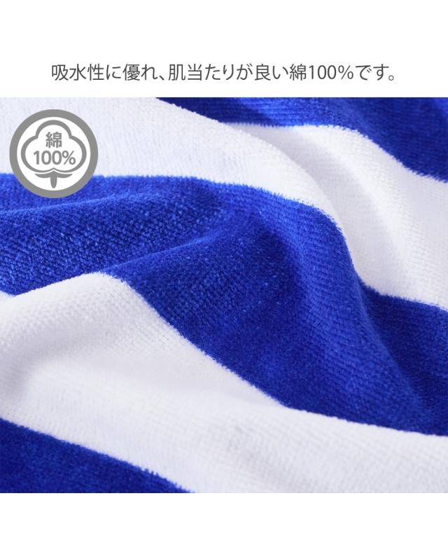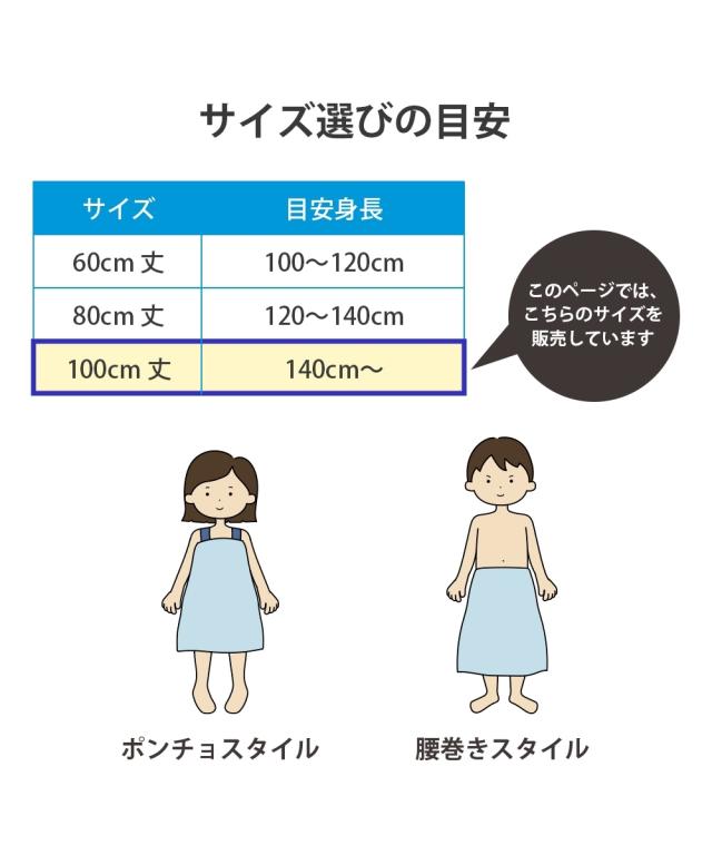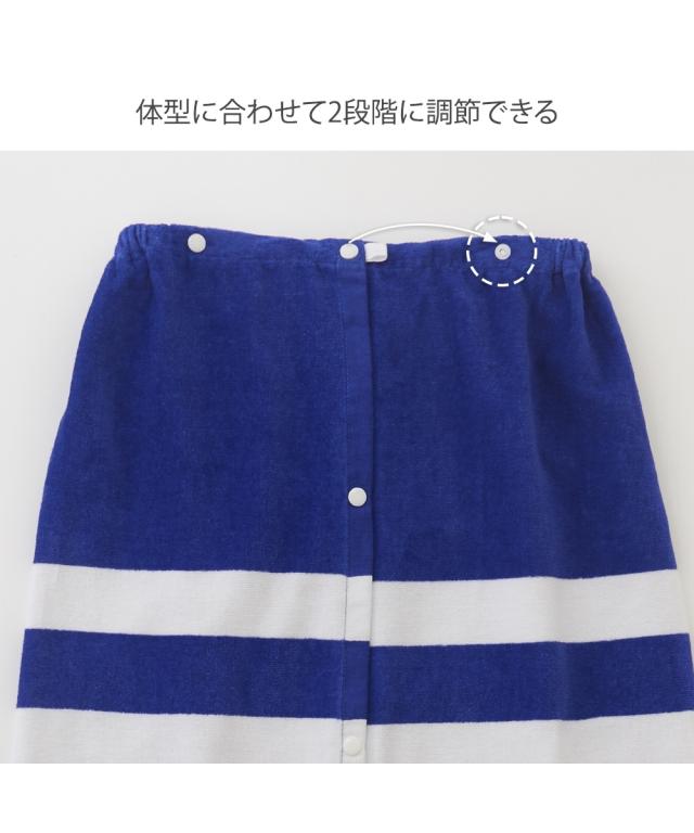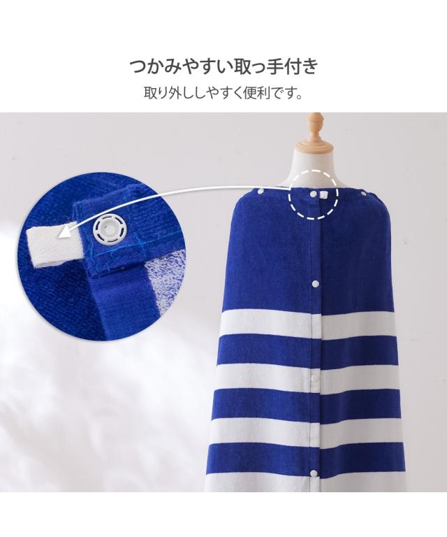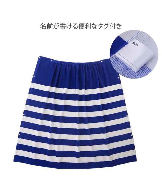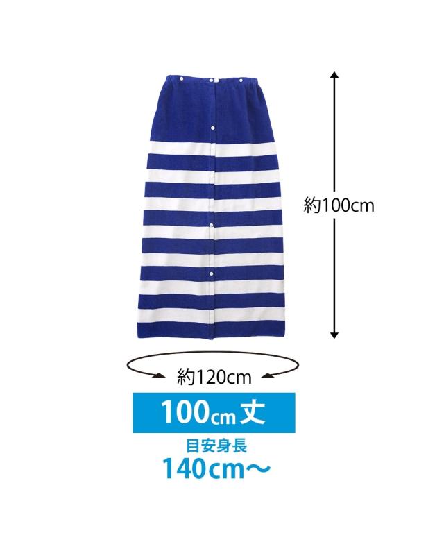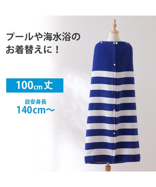長めの100cm丈: 高学年から大人までしっかりカバーできるロングサイズ。 着替えの際も足元まで隠れるため、プライバシーをしっかり守ります。 ■こだわりポイント 吸水性の高いパイル生地: 水分を素早く吸収するタオル素材を採用。プール上がりやシャワー後の濡れた体を優しく包み込みます。 フィット感のあるゴム入りギャザー: 胸元(または腰元)にはしっかりとしたゴムが入っており、動いてもズレ落ちにくい設計です。 ■おすすめポイント・特徴 着替えやすい前開きボタン: スナップボタン式で、お子様でも簡単に着脱が可能。全開にすれば普通のタオルのように広げて使うこともできます。 爽やかなボーダーデザイン: 清潔感のあるブルー×ホワイトの太めボーダー。性別を問わず使いやすく、トレンドに左右されない定番のデザインです。 マルチな活用シーン: プールや海での着替えだけでなく、お風呂上がりのリラックスタイムや、ジム・サウナでの移動用としても重宝します。 ■こんな人におすすめ 成長期のお子様や学生の方: 80cm丈では短く感じてきた小学校高学年中学生の方に最適です。 プールやレジャーを楽しむ大人の方: 海水浴やジムのシャワー室など、公共の場でのスマートな着替