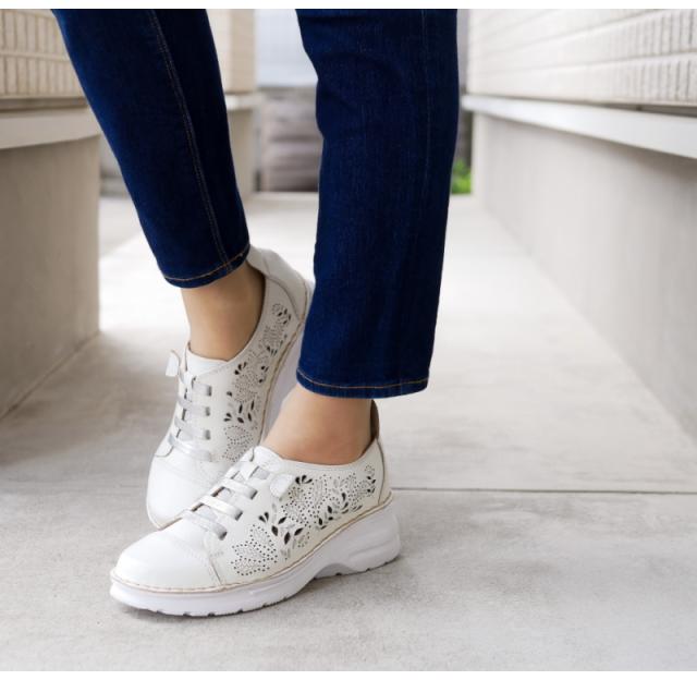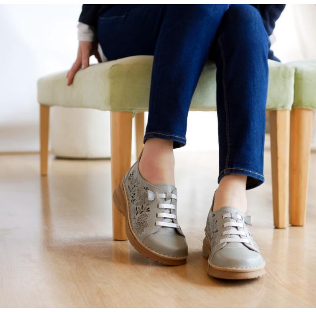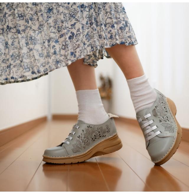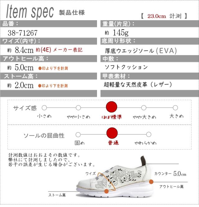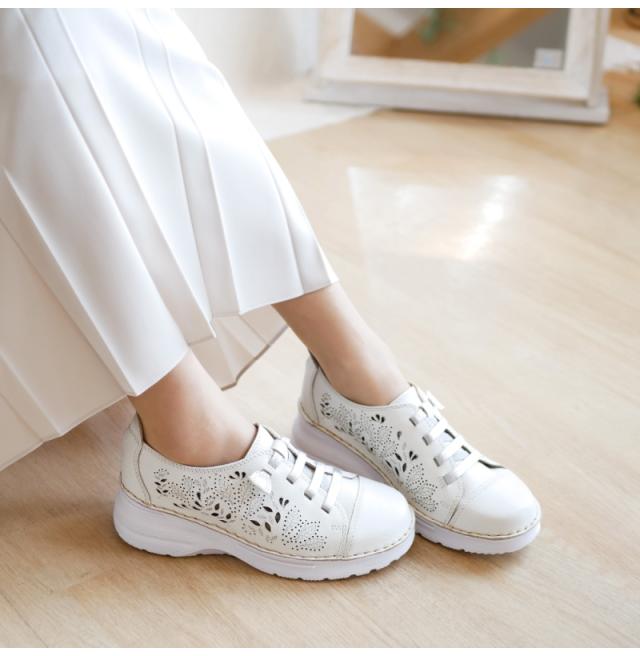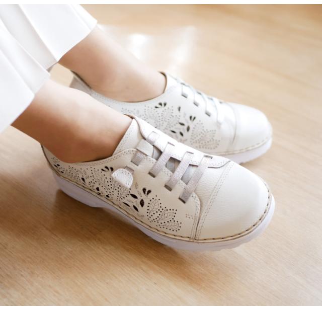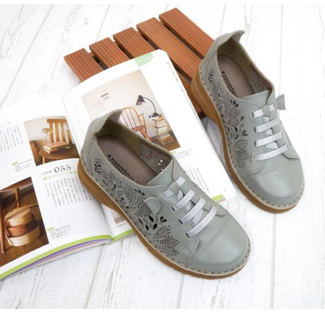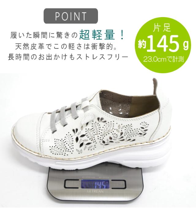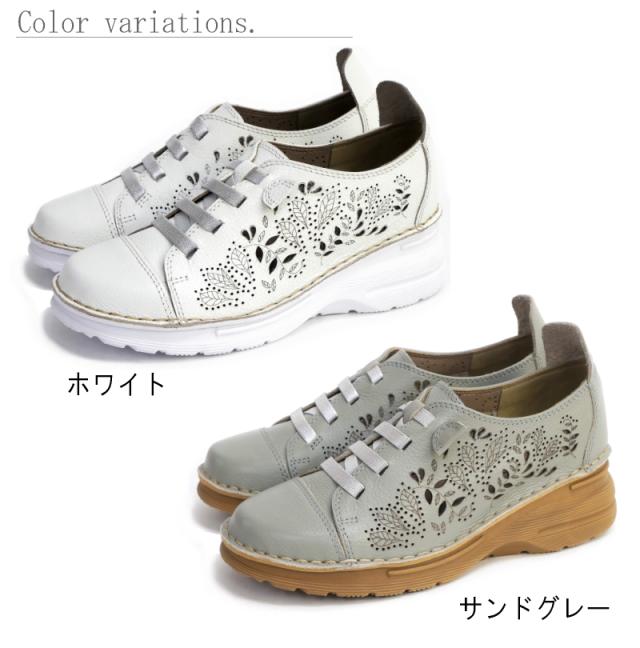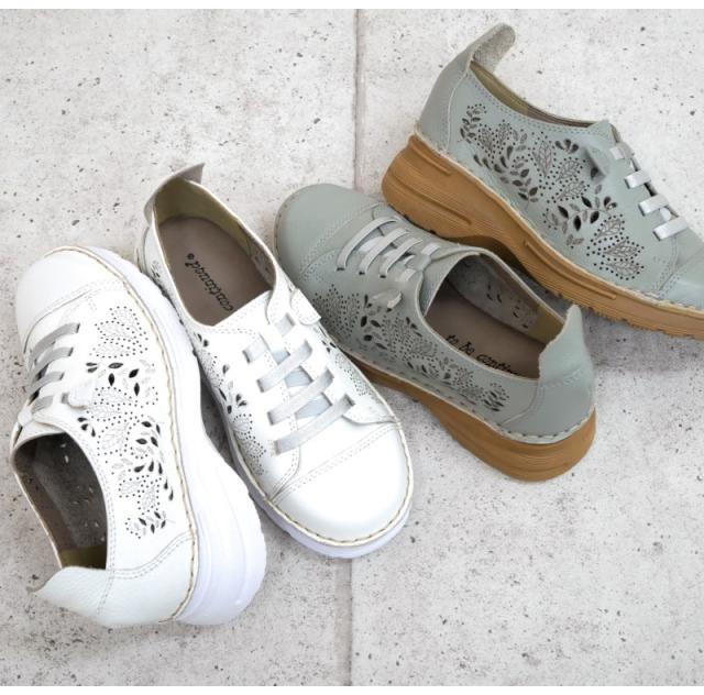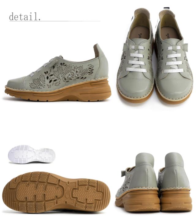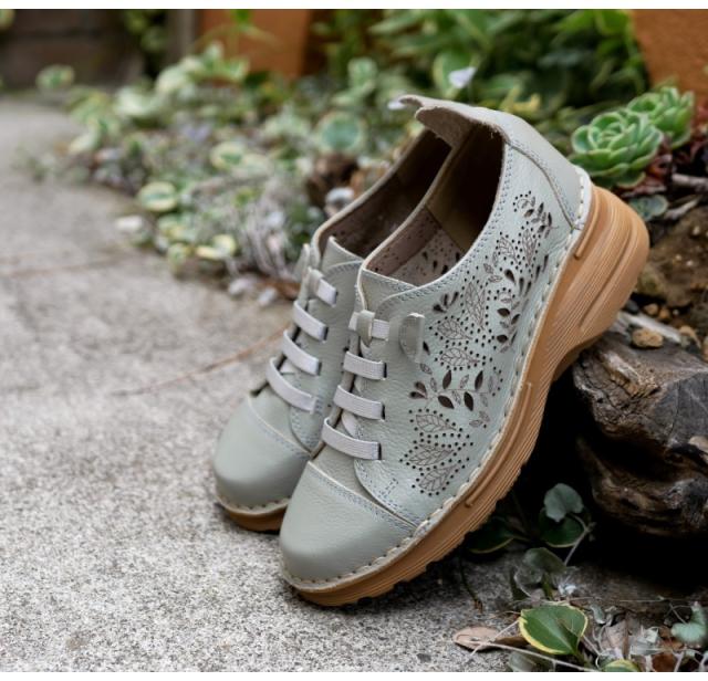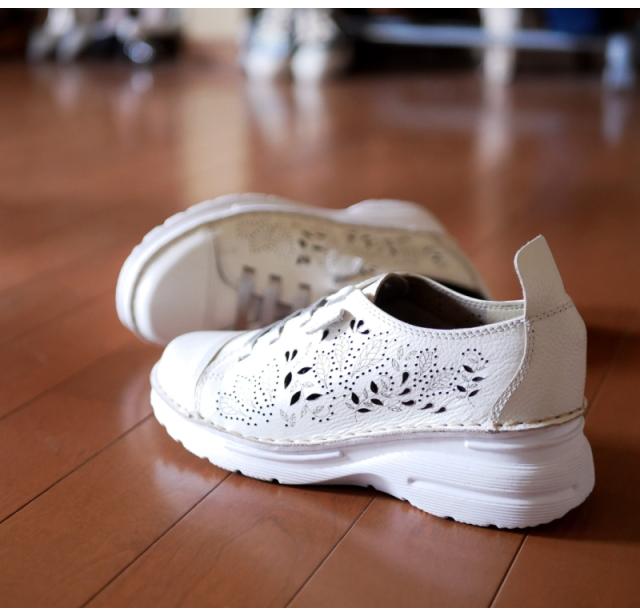 超軽量!天然皮革・ゴムレースアップ・ボタニカル柄パンチング・ウエッジソールシューズ