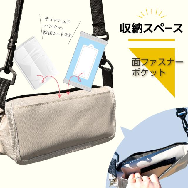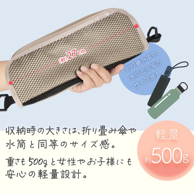 かんたん組み立て&カンタン収納。 収納袋から座椅子にサッと組み立てられます。 収納時のサイズ感は、折りたたみ傘や水筒くらいで持ち運びに便利! 収納袋時はメッシュポケットと面ファスナーポケット付きで小物を収納できます。 ショルダーベルト付きなので持ち運びにも便利!