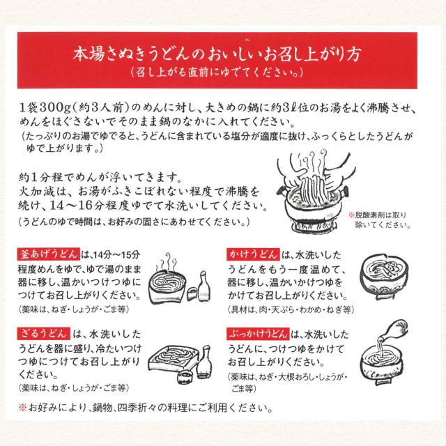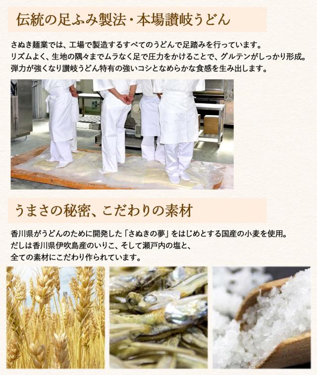 こちらの商品は、九十余年来受け継いでこられた伝統の工程「足踏み製法」により、足で踏んで鍛えてうどん生地をつくっています。生地を袋に入れて踏む→休ませる→また踏む。これを繰り返し、足でゆっくり圧力をかけることでグルテンがしっかり形成、弾力が強くなり讃岐うどん特有の強いコシとなめらかな食感を生み出します。うどん生地を足で丁寧に踏み込み時間をかけて鍛え上げる「足踏み製法」は、伝統の手作り感・職人感が感じられます。