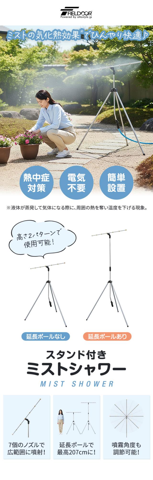FIELDOOR ミストシャワー 散水シャワーキット 自立式 延長ポール・スタンド付き ドライミスト 熱中症対策 夏 暑さ対策 屋外 冷却 ミストノズル 散水 ベランダ 庭 ミスト 涼しい 家庭用 水道 アウトドア BBQ 水遊び 簡単 自作 DIY 1年保証 送料無料